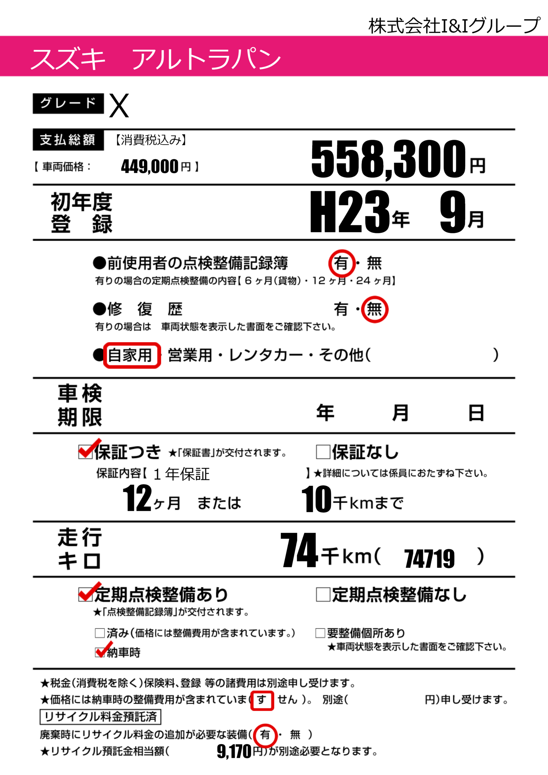 | 走行キロ | 7.4万km | 初年度登録 | H23年9月 |