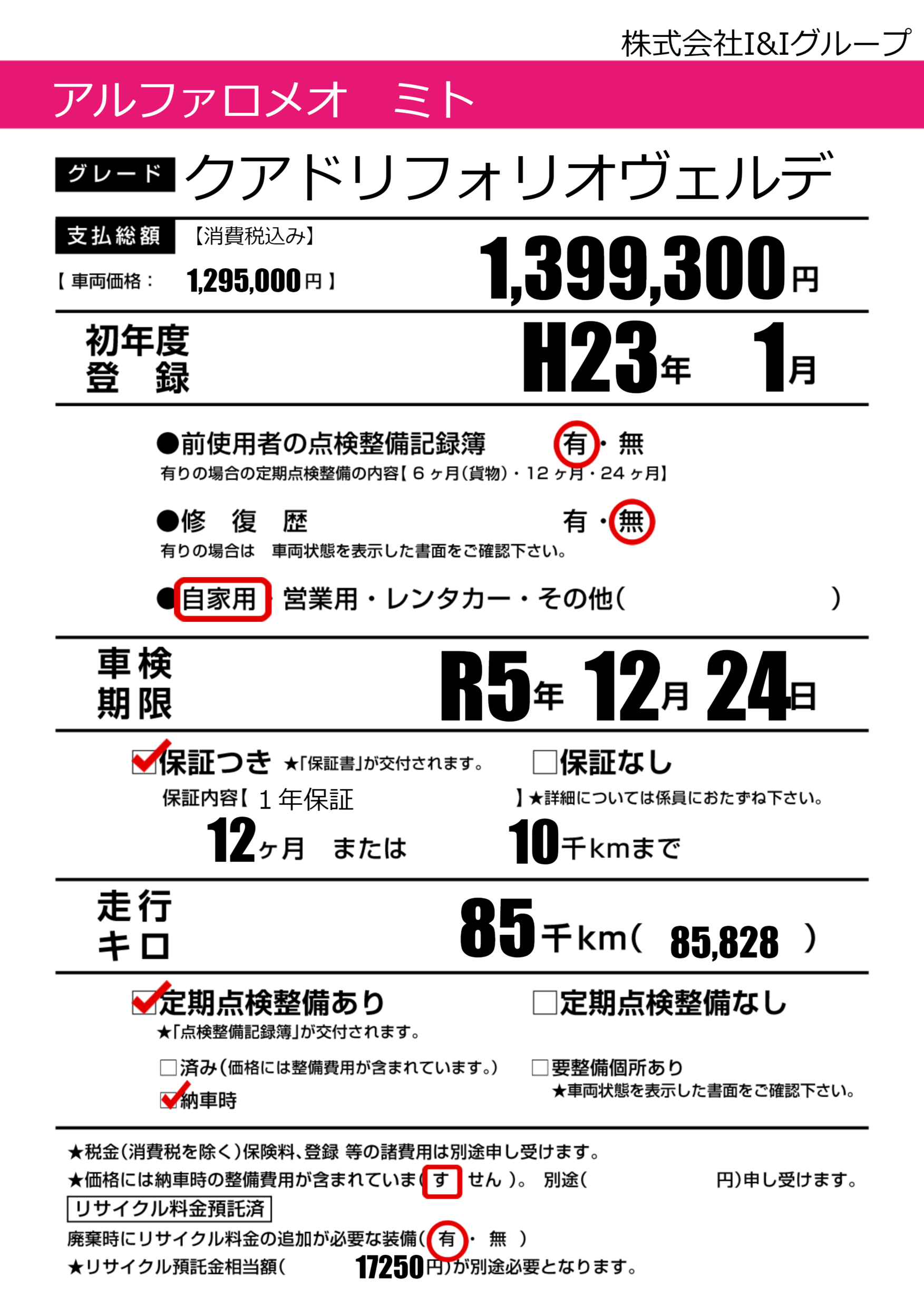 | 車名 | アルファロメオ ミト | グレード ミッション 排気量 |