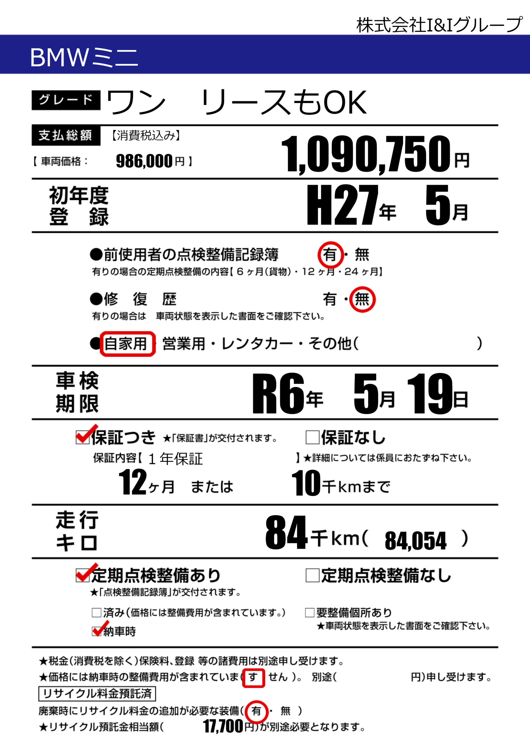 | 車名 | BMWミニ | グレード ミッション 排気量 |