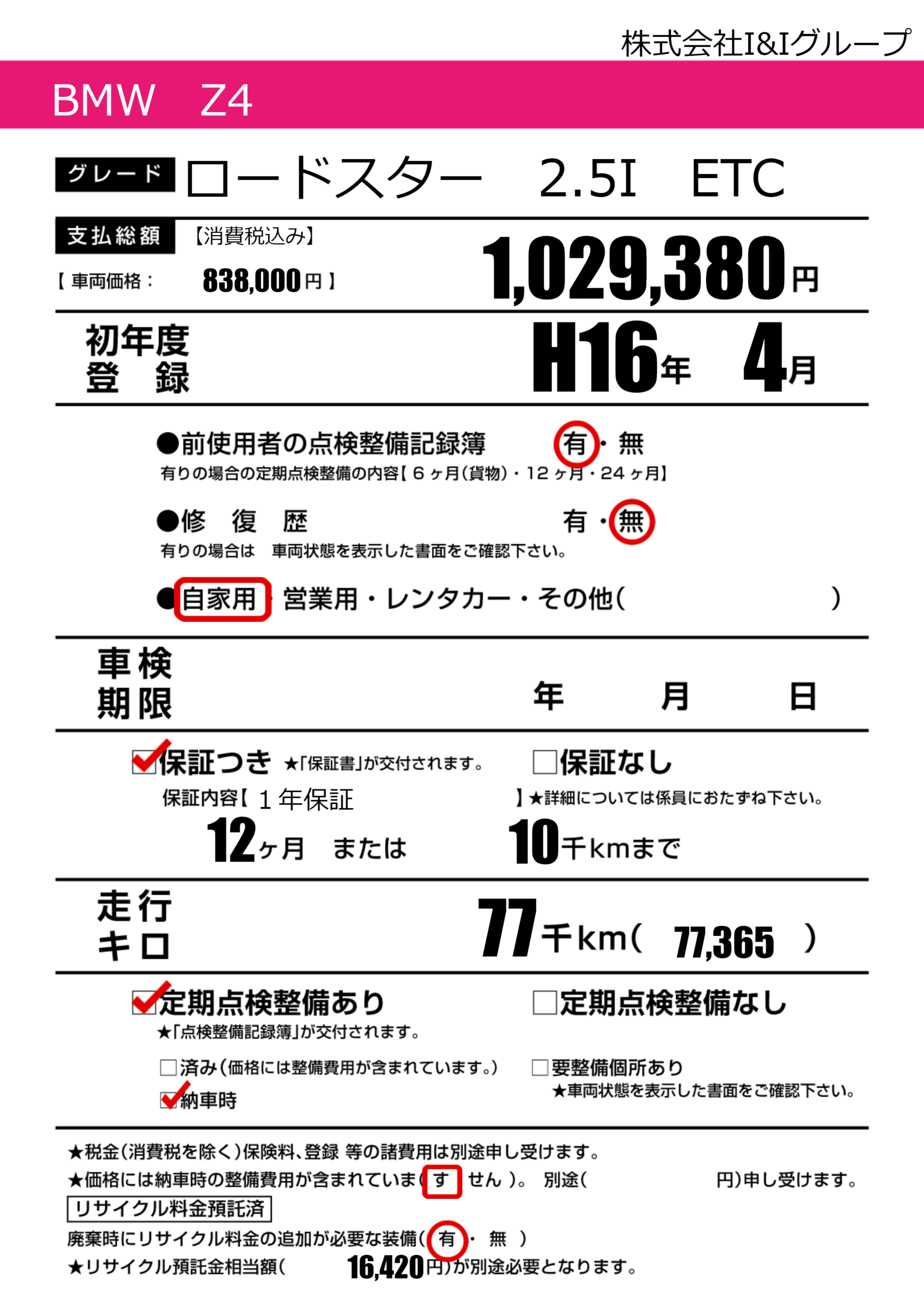 保証付き 保証内容(1年保証) 12ヶ月または(10)千kmまで |