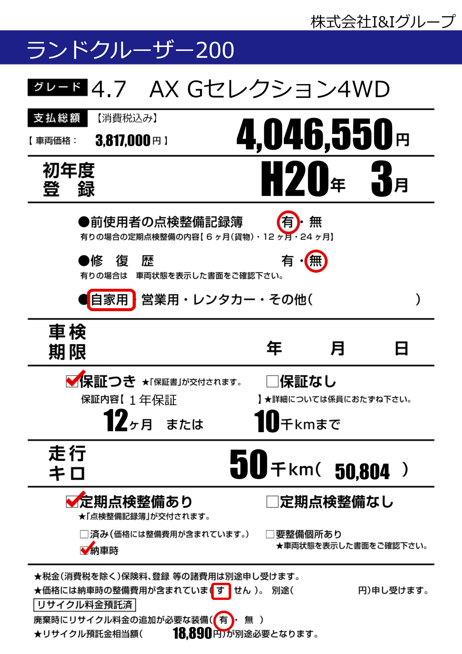 | 車名 | ランドクルーザー200 | グレード ミッション 排気量 |