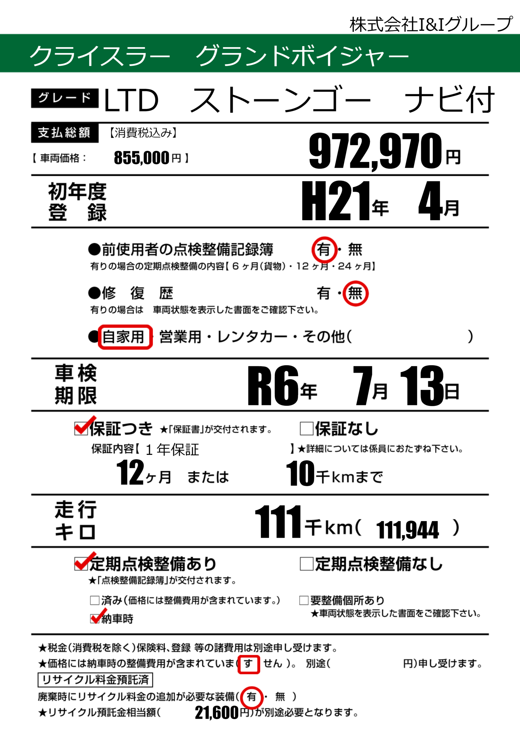 | 車名 | クライスラー グランドボイジャー | グレード ミッション 排気量 |