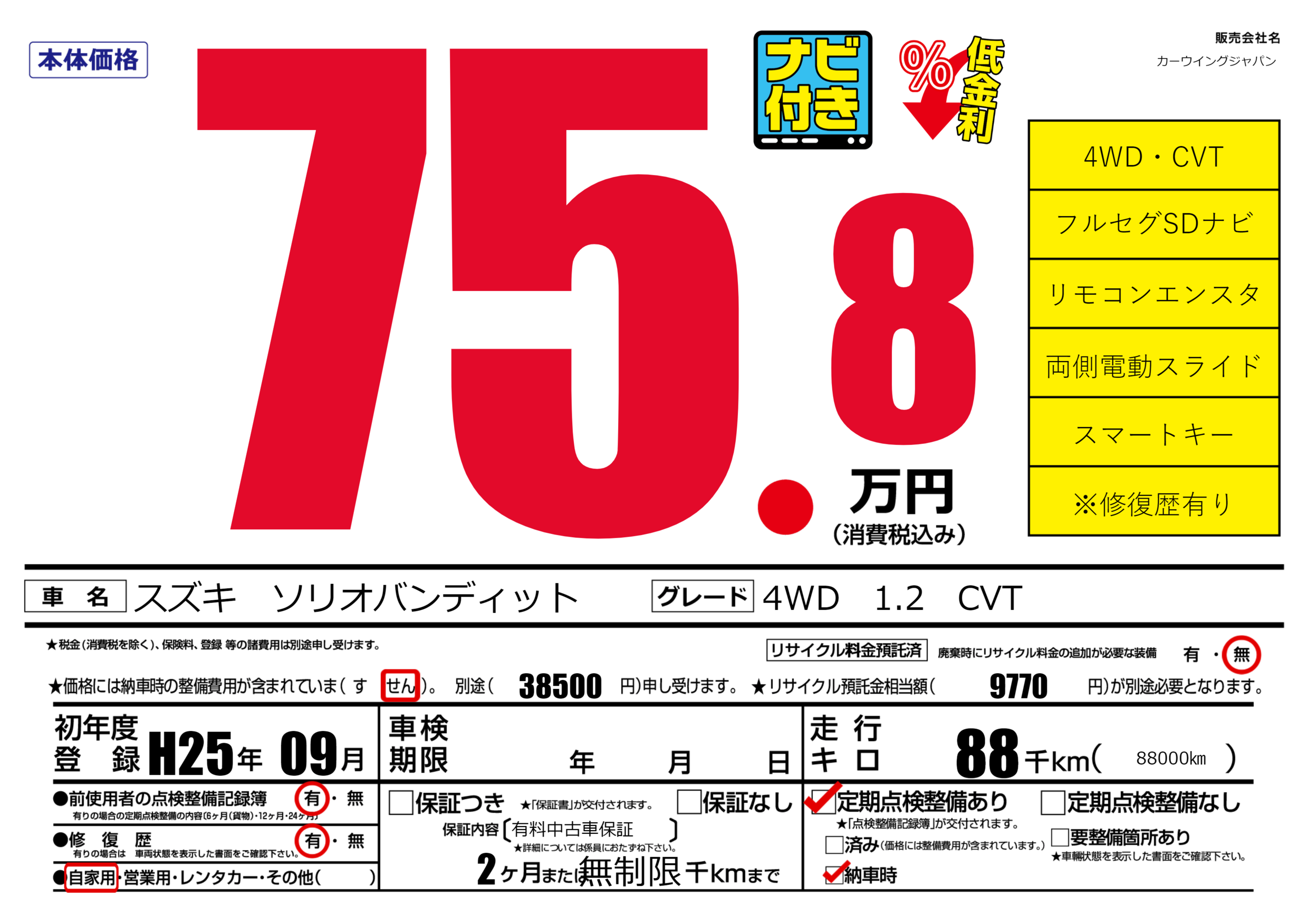保証なし 保証内容(有料中古車保証) 2ヶ月または(無制限)千kmまで |