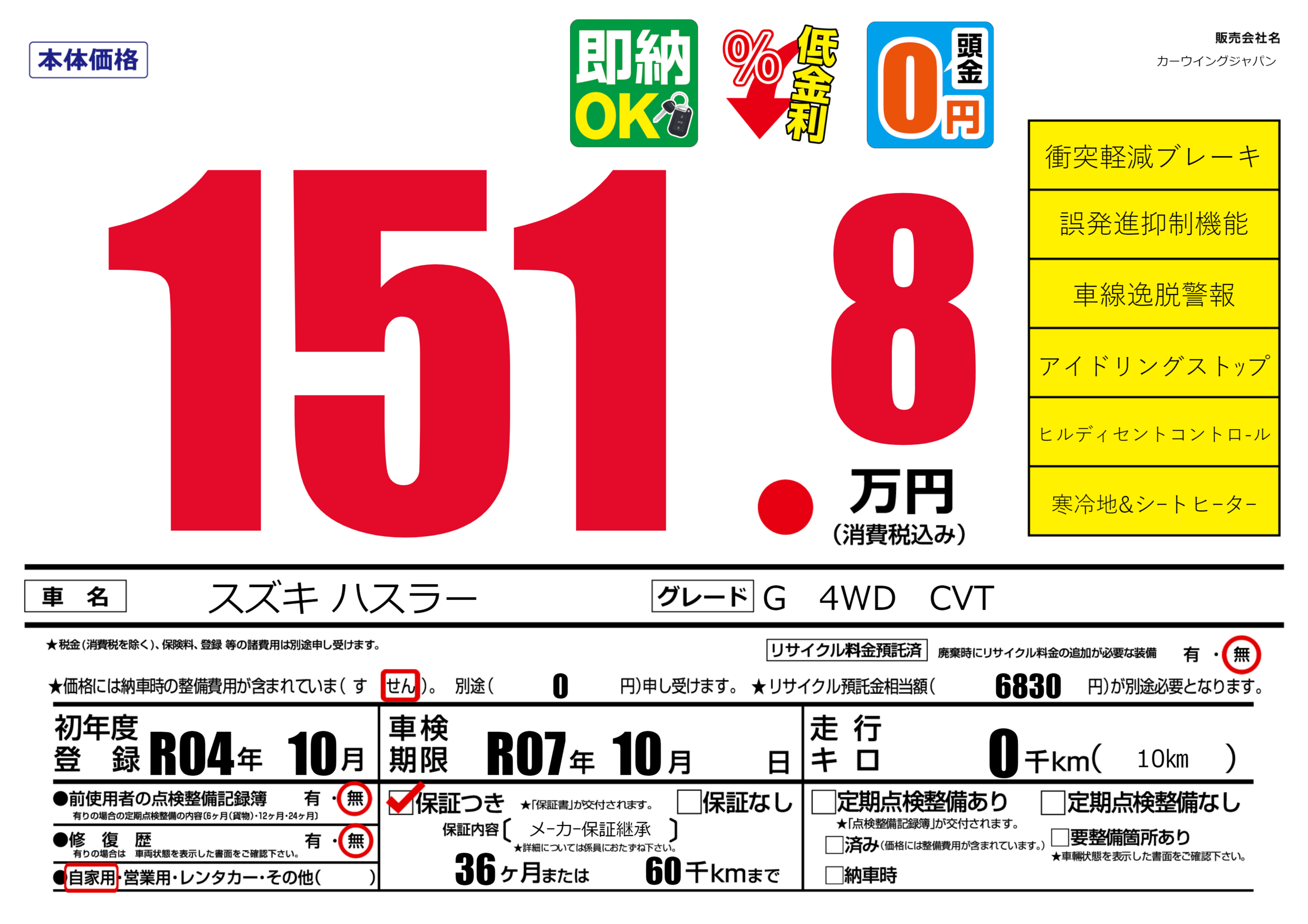 | 車名 | スズキ ハスラー | グレード ミッション 排気量 |