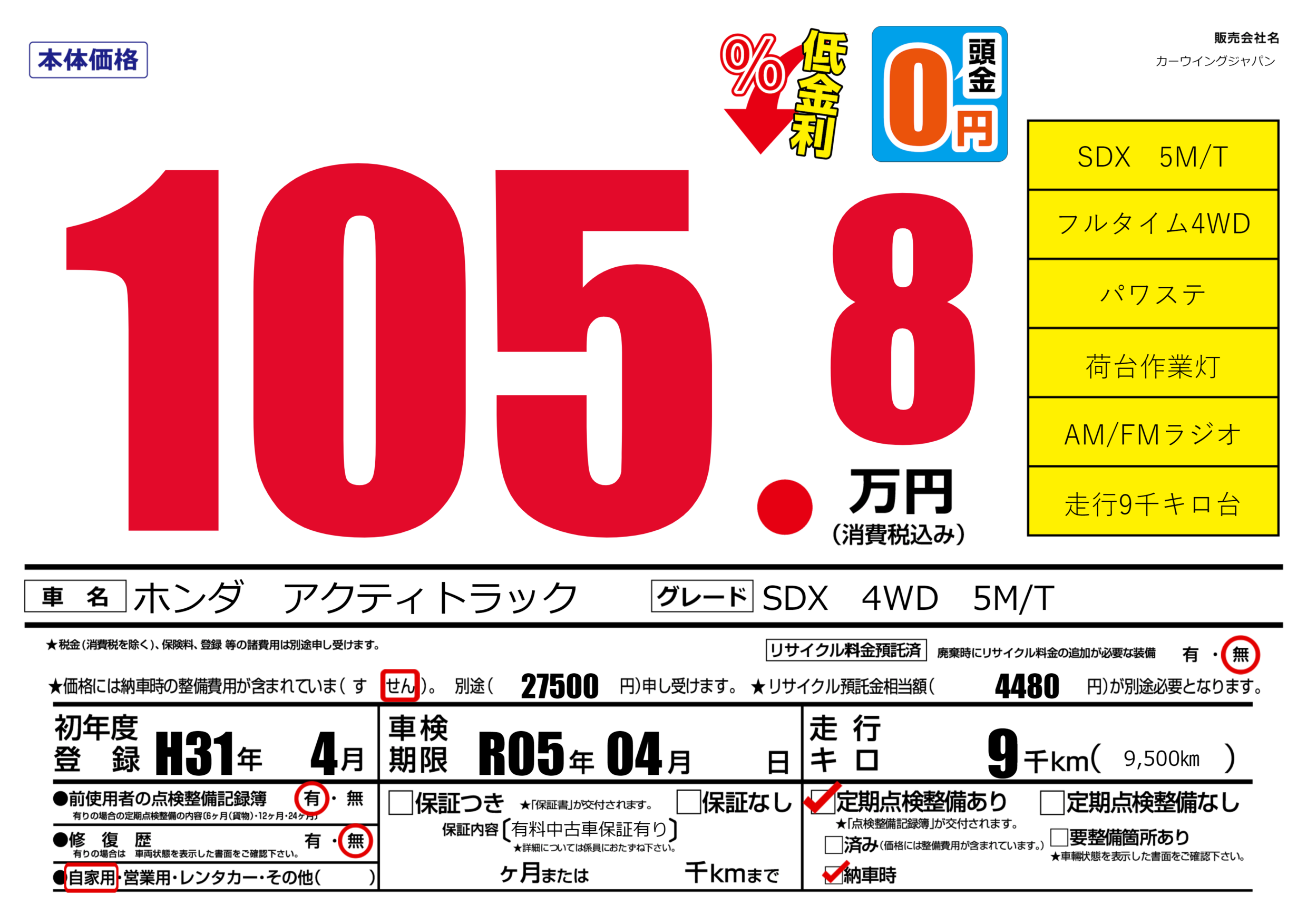 | 車名 | ホンダ アクティトラック | グレード ミッション 排気量 |