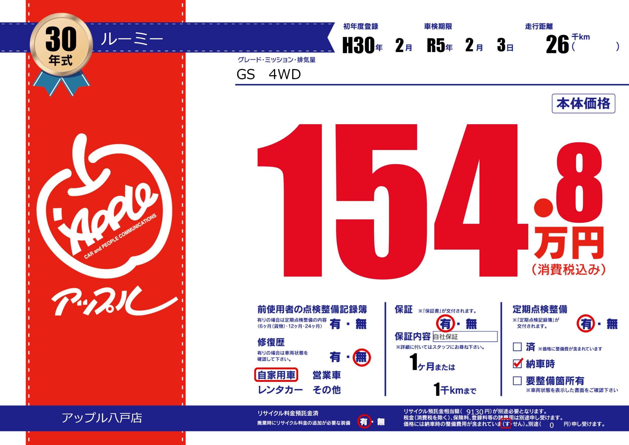 保証付き 保証内容(自社保証) 1ヶ月または(1)千kmまで |