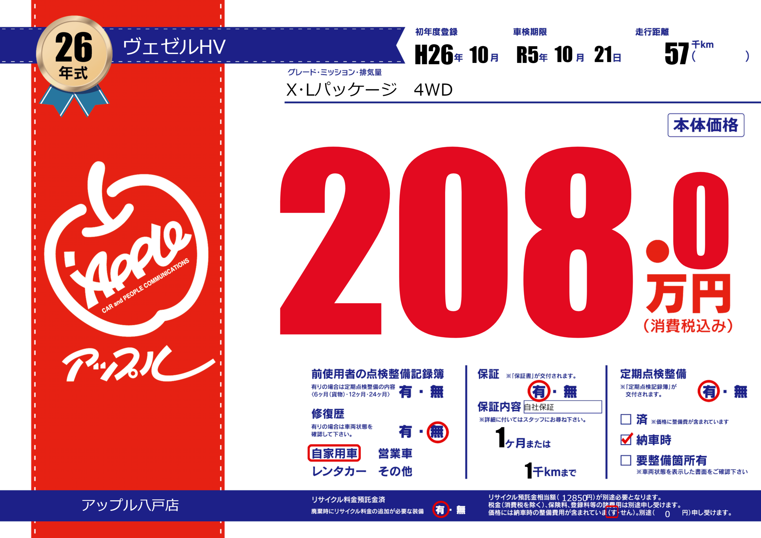 | 車名 | ヴェゼルHV | グレード ミッション 排気量 |