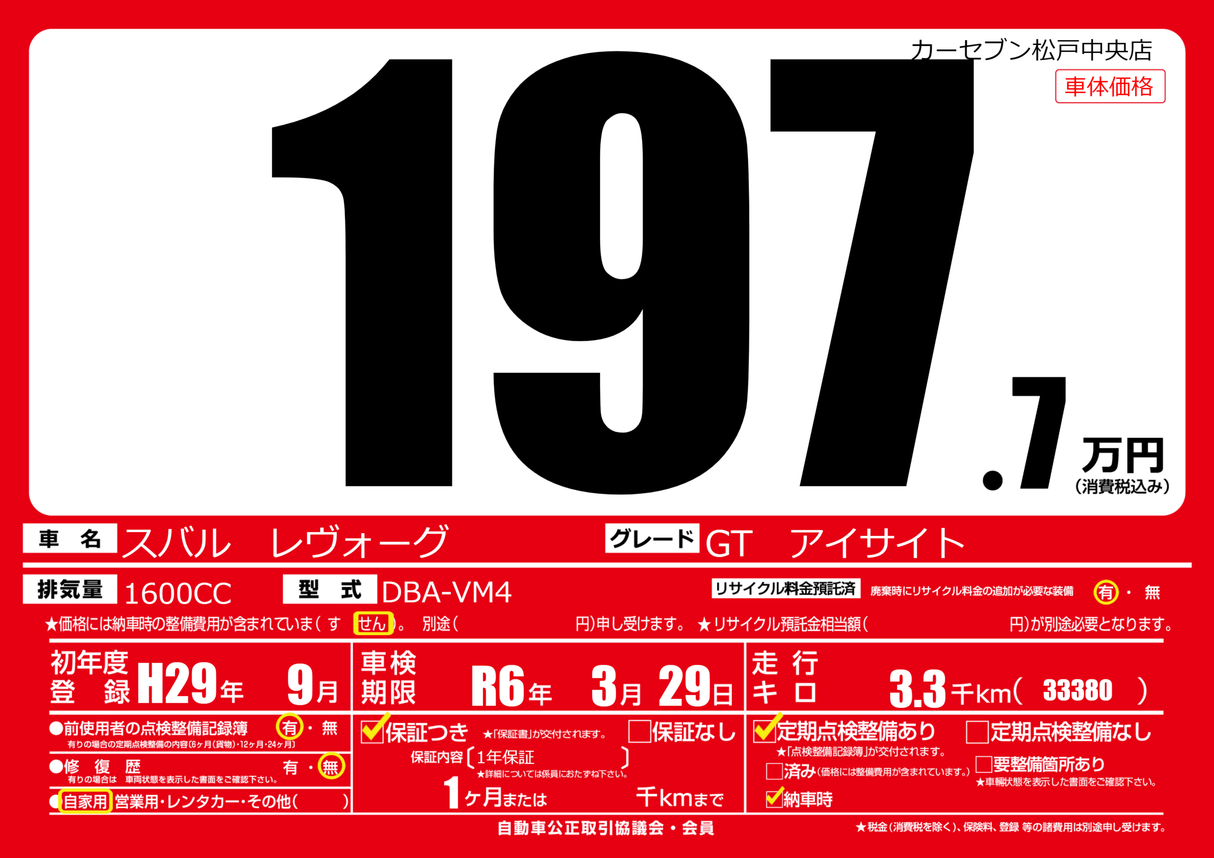 | 車名 | スバル レヴォーグ | グレード ミッション 排気量 |