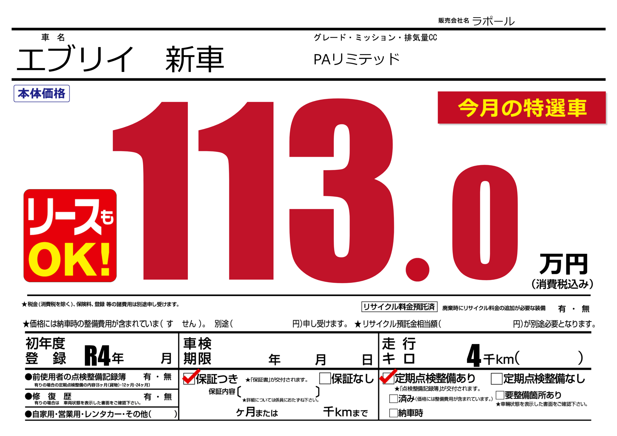 | 車名 | エブリイ 新車 | グレード ミッション 排気量 |