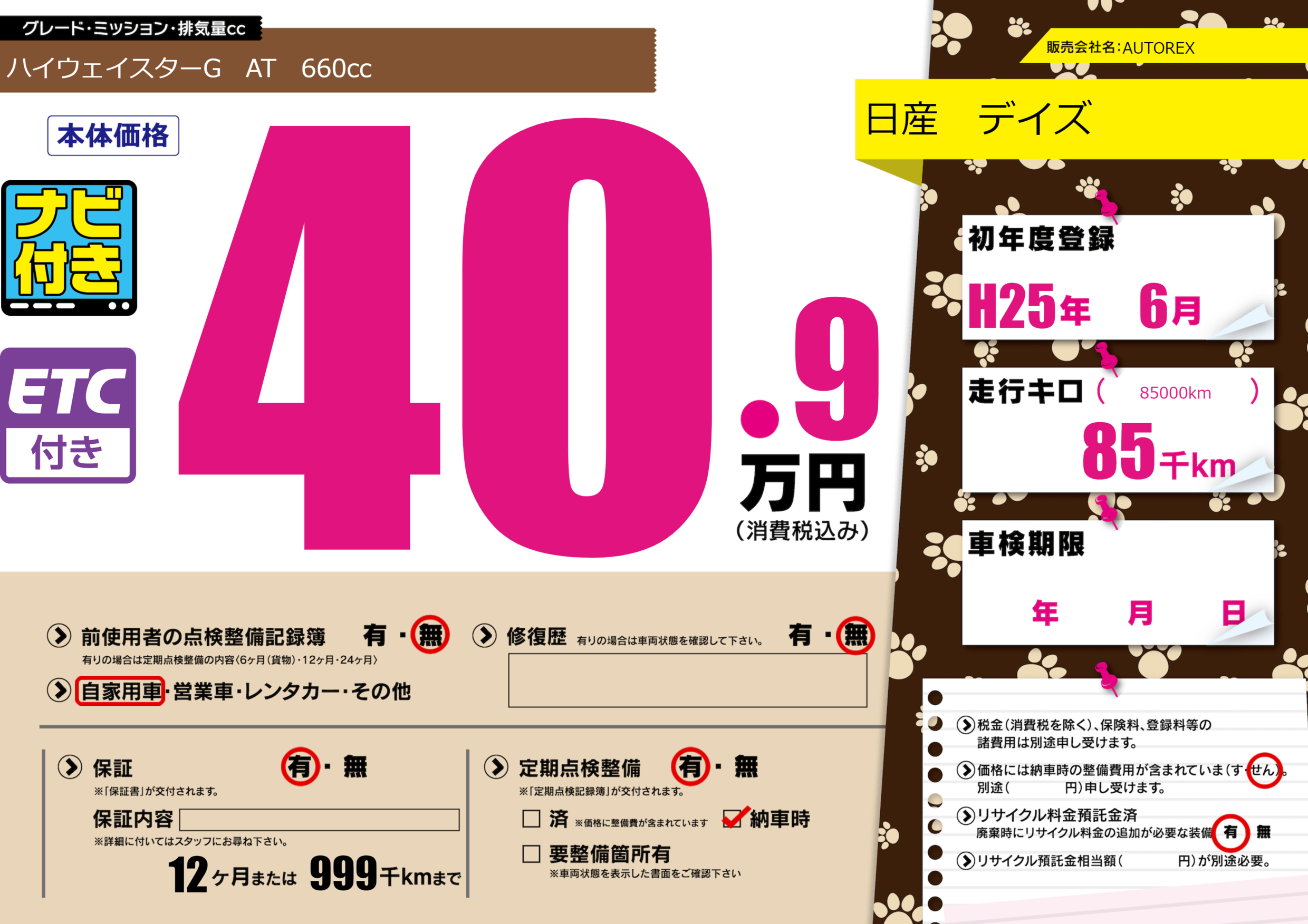 | 車名 | 日産 デイズ | グレード ミッション 排気量 |