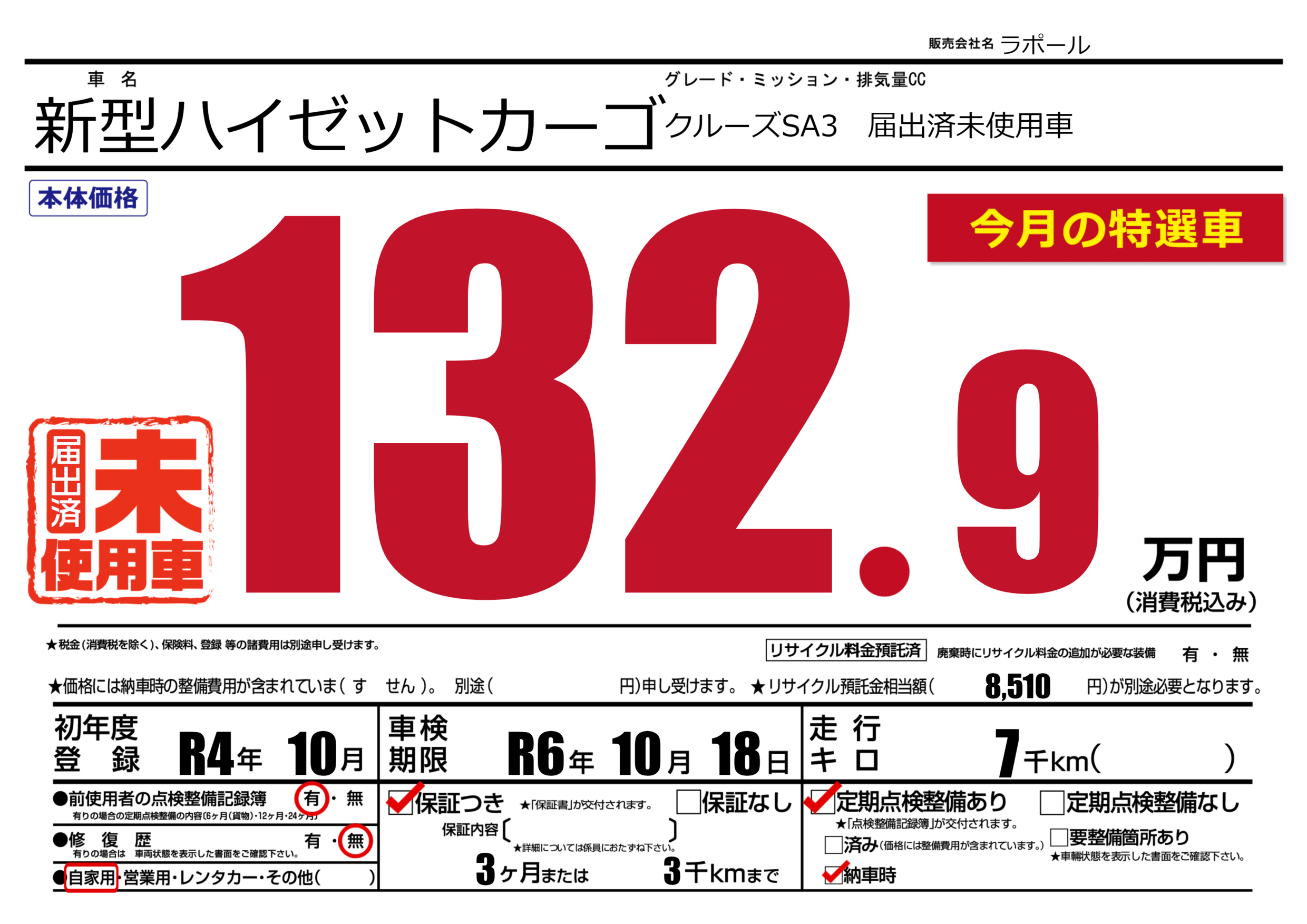 保証付き 保証内容(---) 3ヶ月または(3)千kmまで |