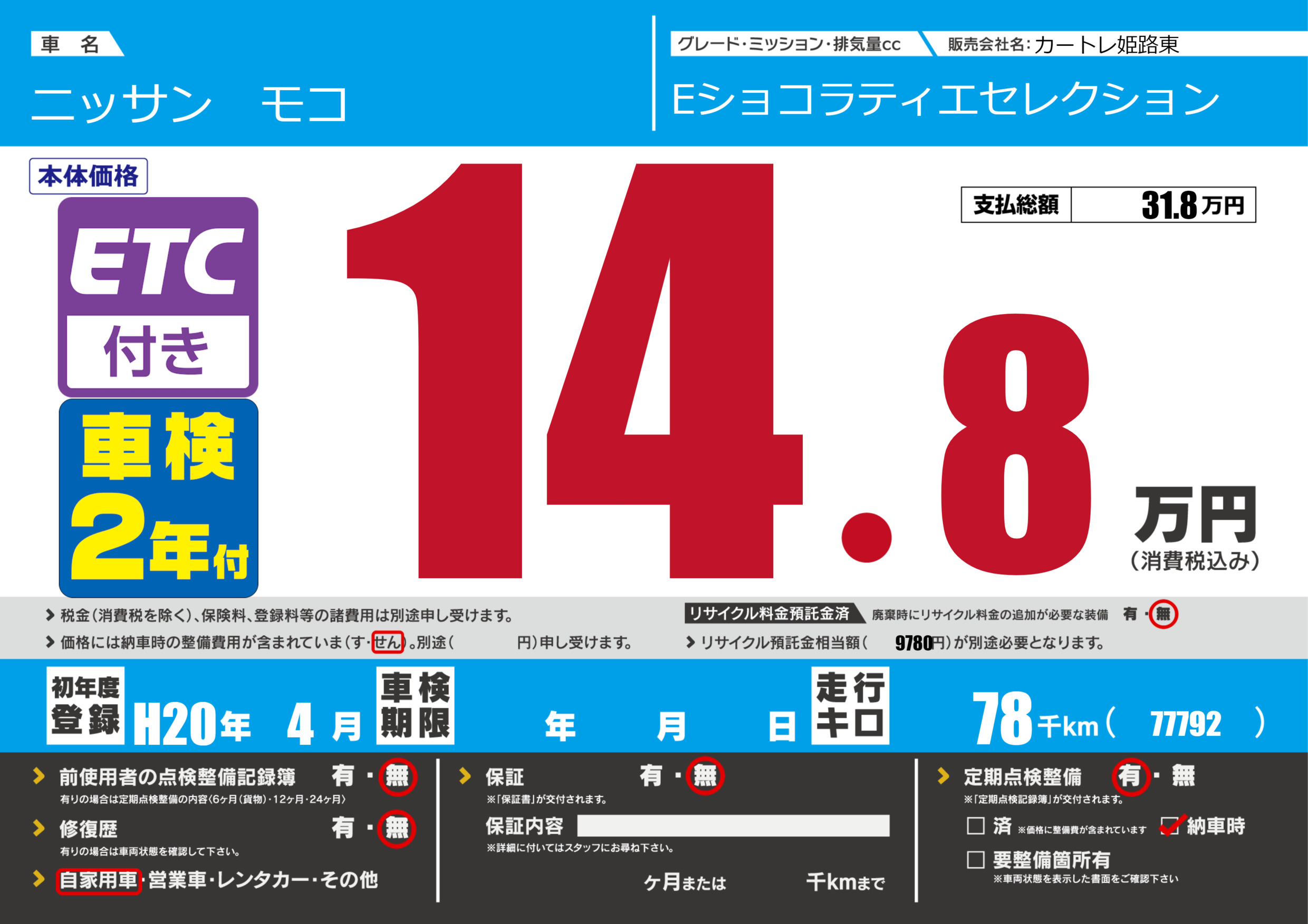 | 車名 | ニッサン モコ | グレード ミッション 排気量 |