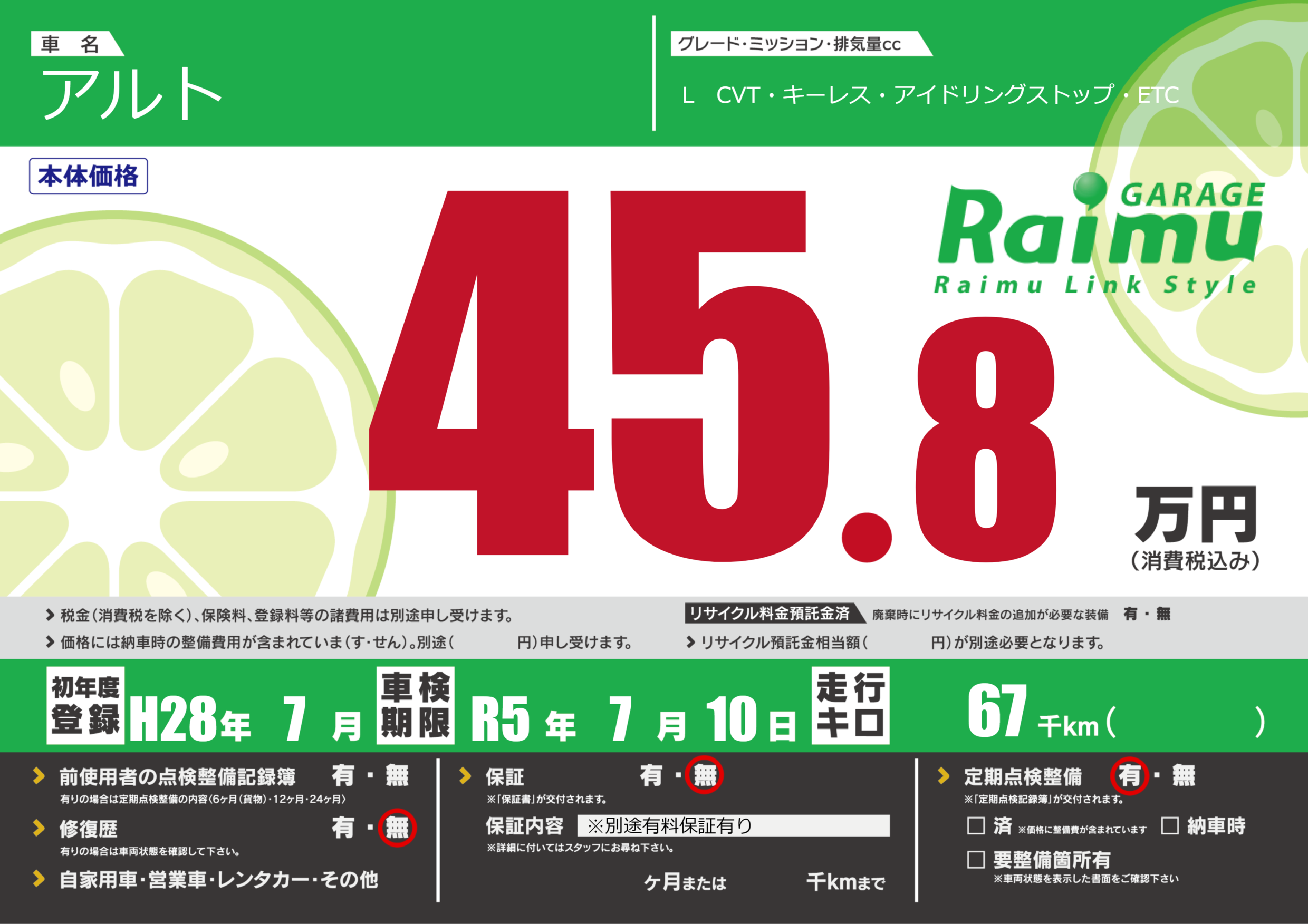 保証なし 保証内容(※別途有料保証有り) ---ヶ月または()千kmまで |