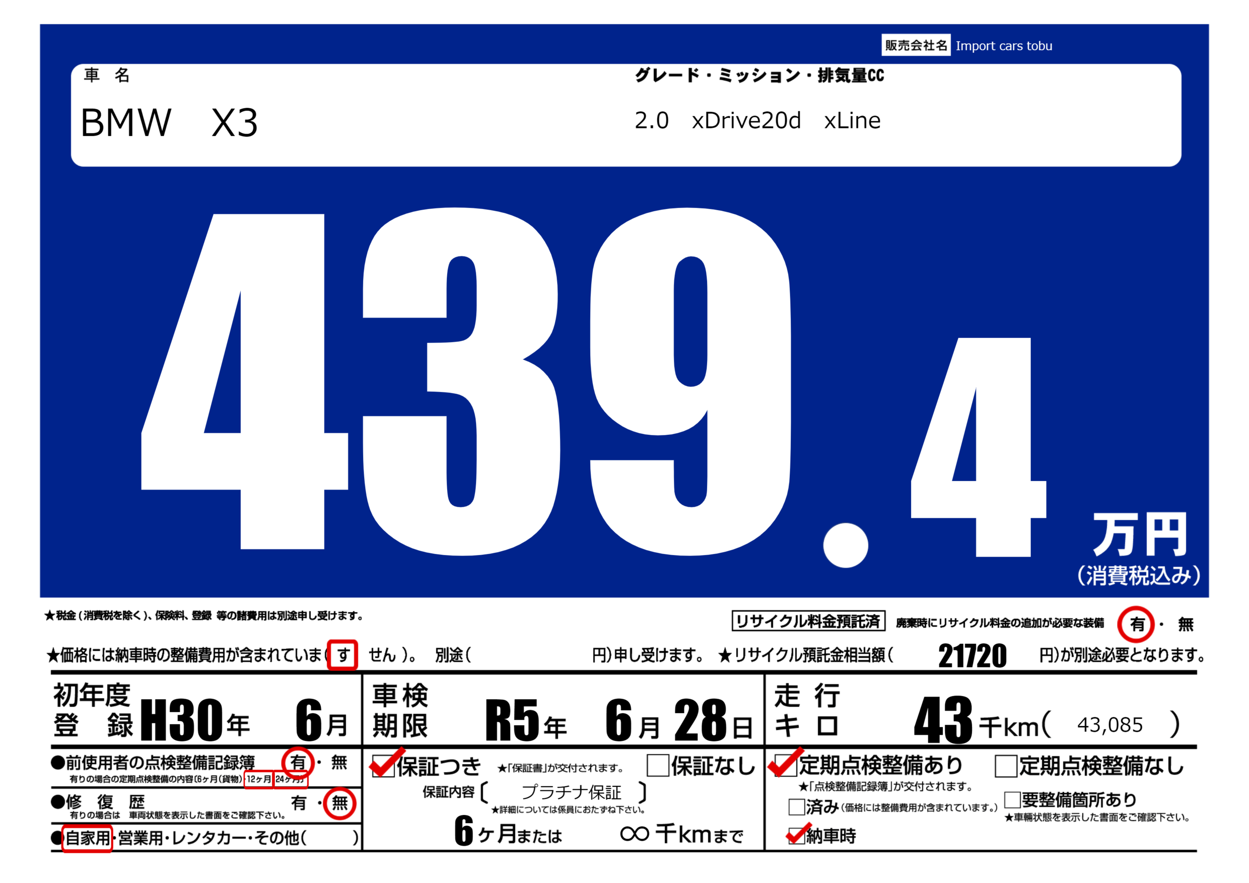 | 車名 | BMW X3 | グレード ミッション 排気量 |
