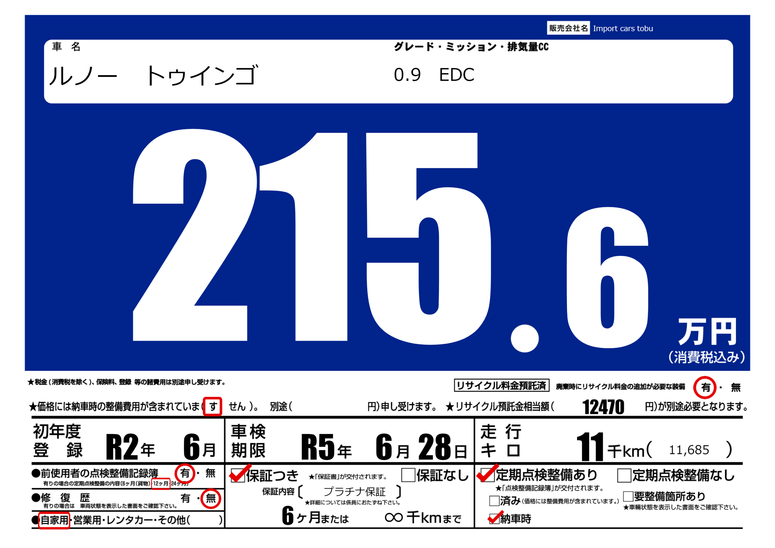 保証付き 保証内容( プラチナ保証) 6ヶ月または(∞)千kmまで |