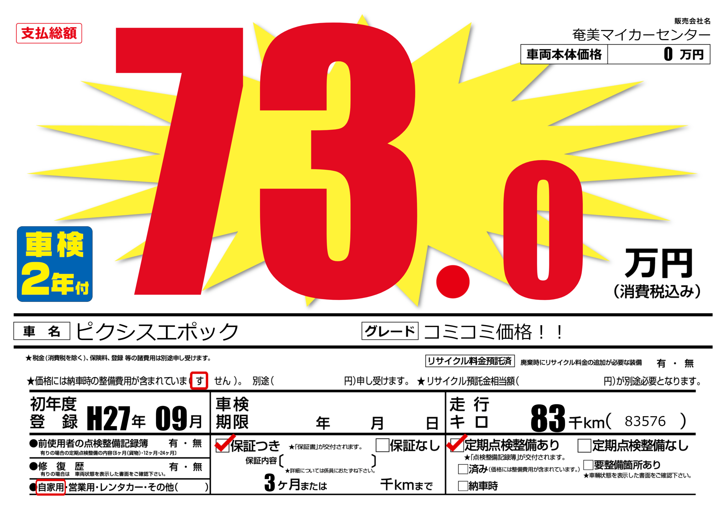| 走行キロ | 8.3万km | 初年度登録 | H27年09月 |
