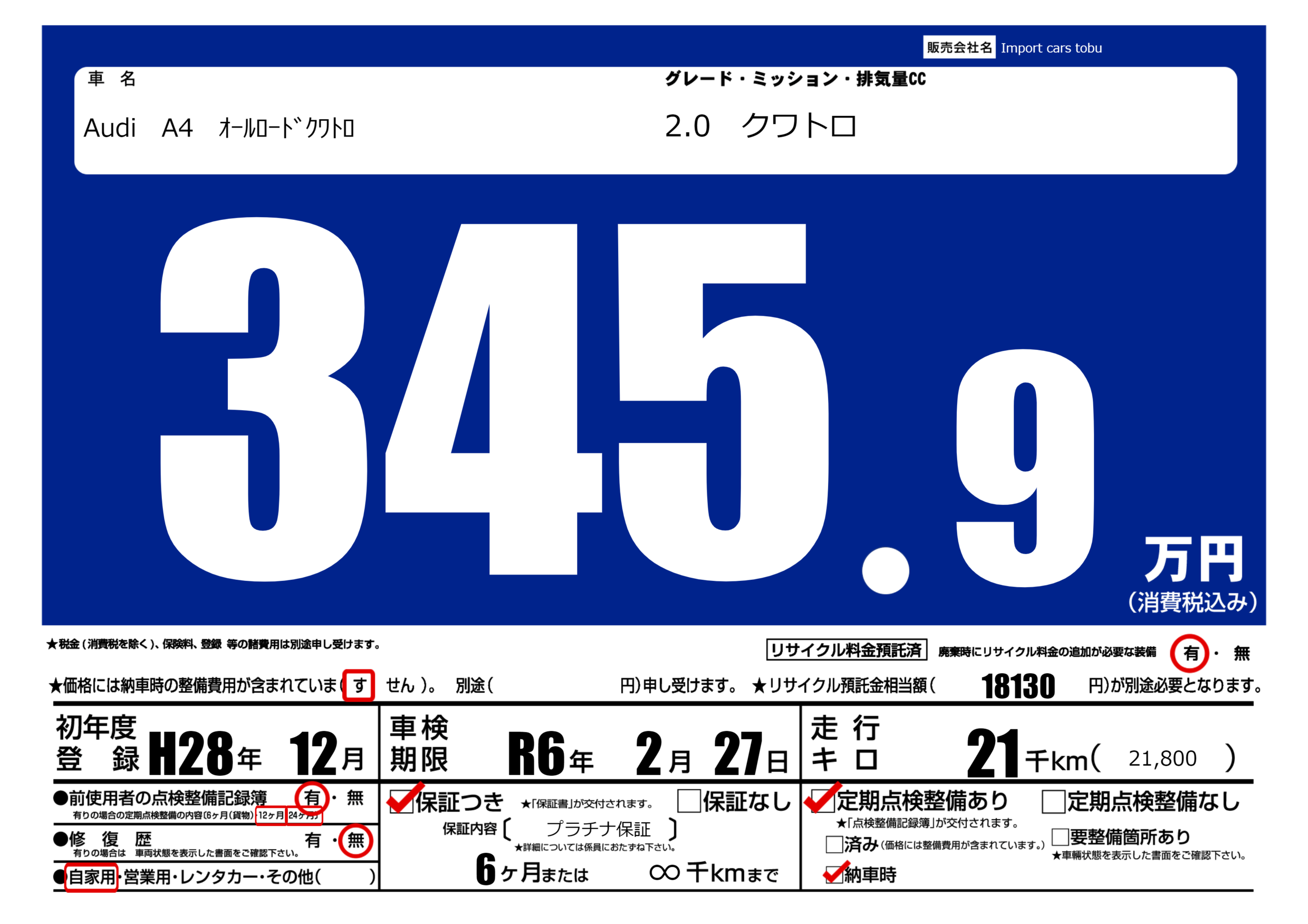 保証付き 保証内容( プラチナ保証) 6ヶ月または(∞)千kmまで |