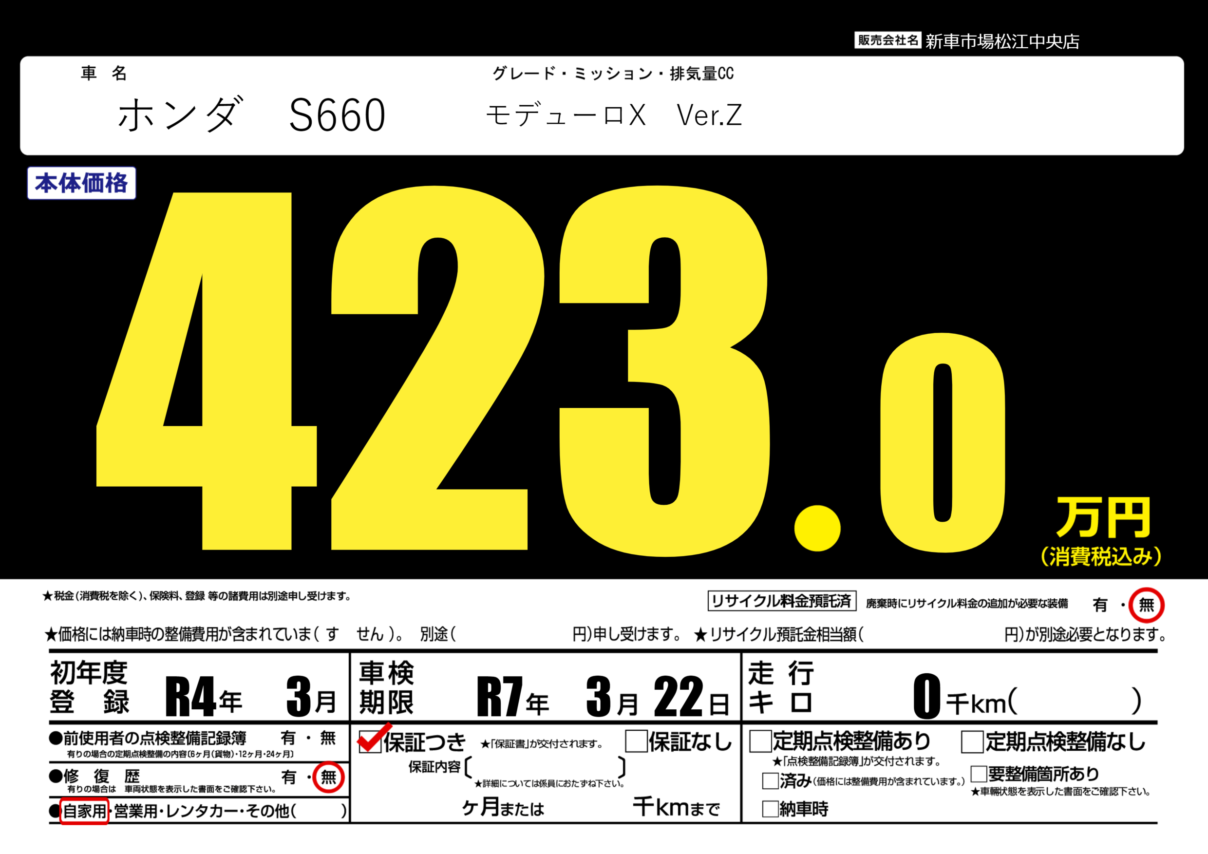 | 車名 | ホンダ S660 | グレード ミッション 排気量 |