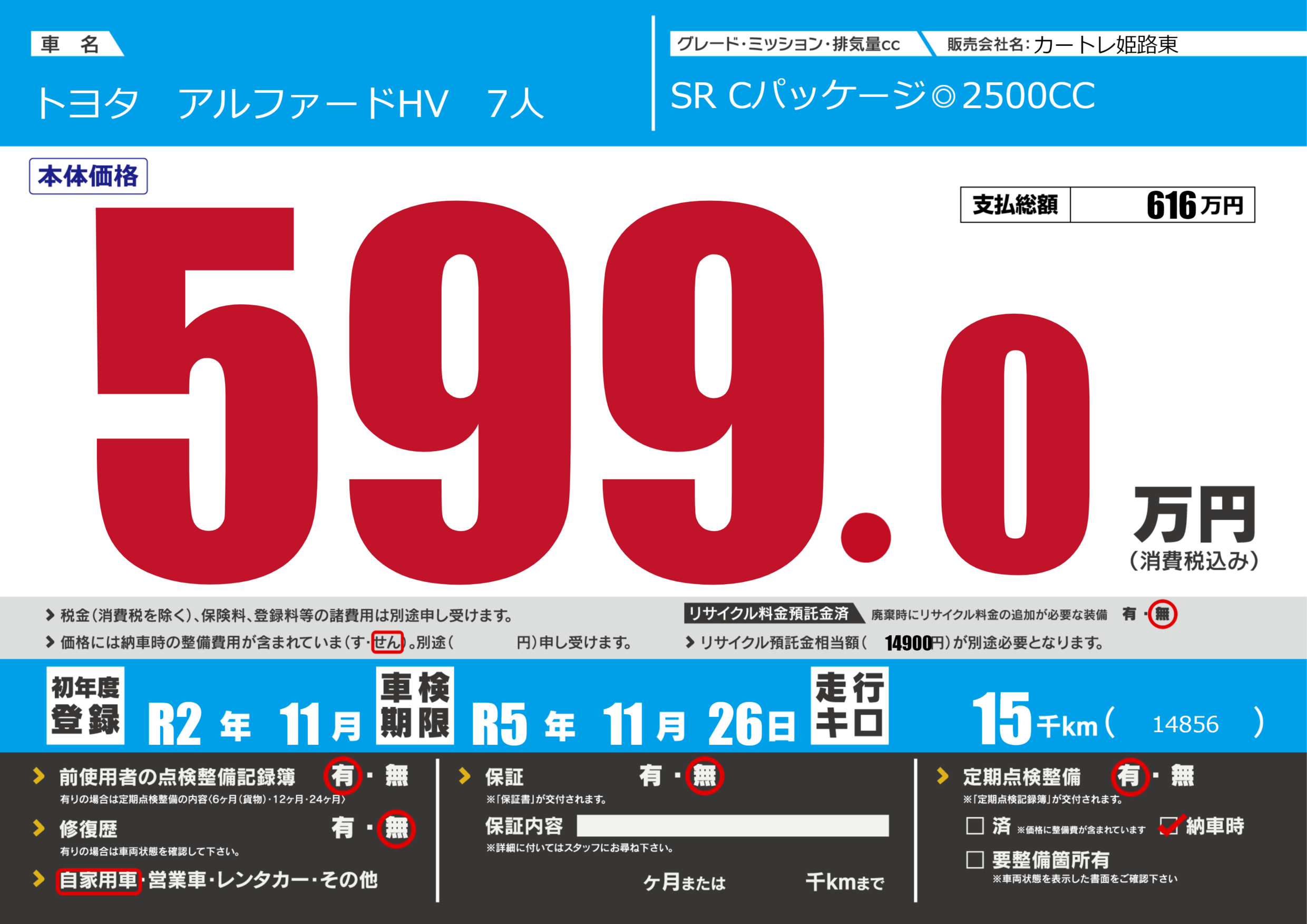 | 定期点検整備 | 定期点検整備あり 納車時あり | ||