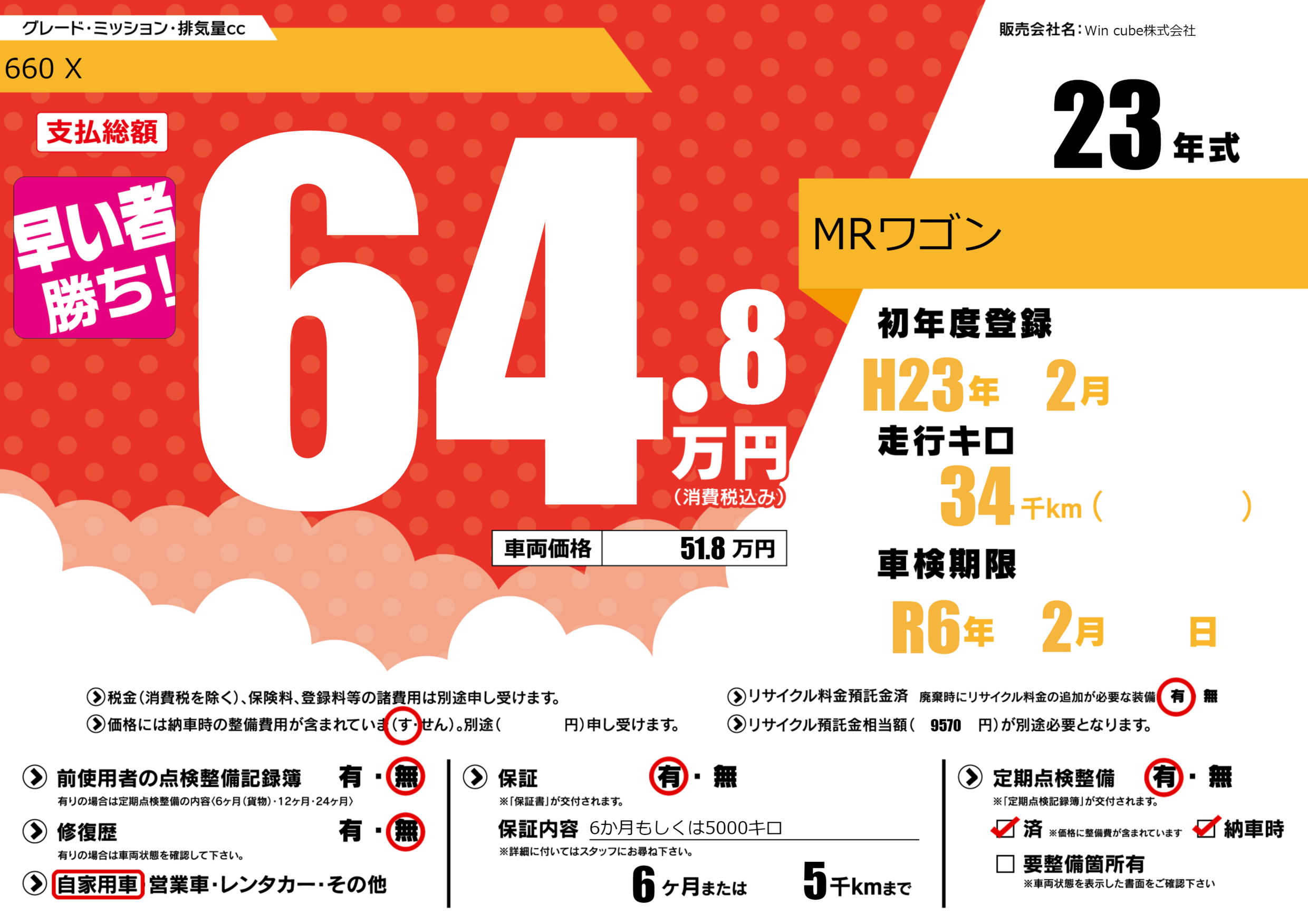 | 車名 | MRワゴン | グレード ミッション 排気量 |