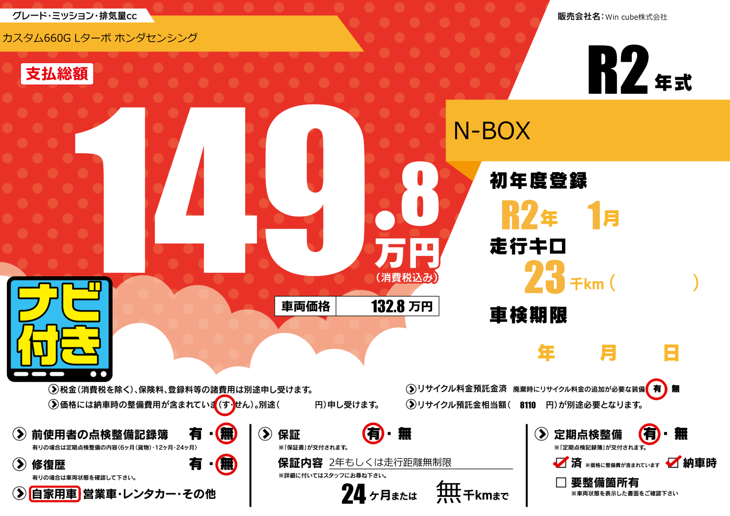 | 定期点検整備 | 定期点検整備あり 定期点検整備済み 納車時あり | ||