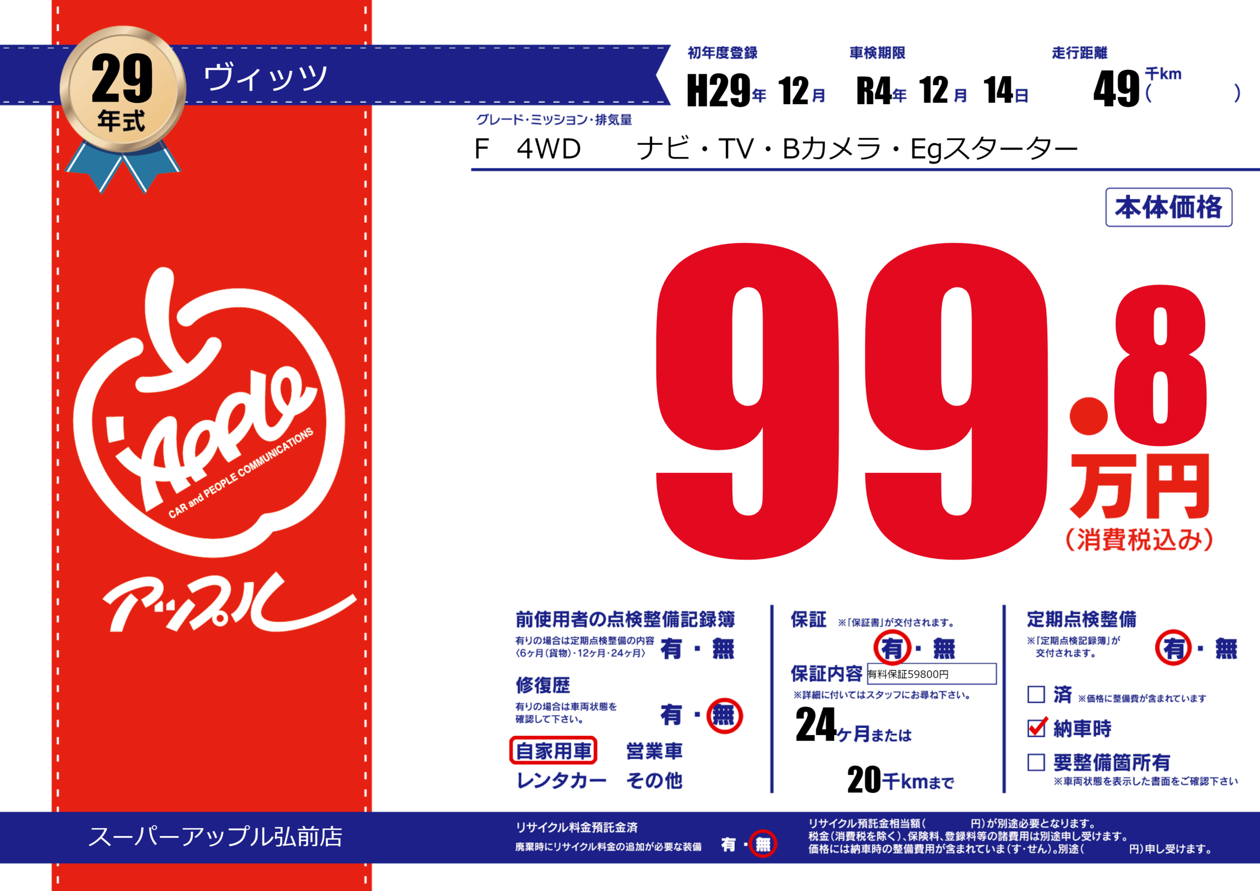 保証付き 保証内容(有料保証59800円) 24ヶ月または(20)千kmまで |