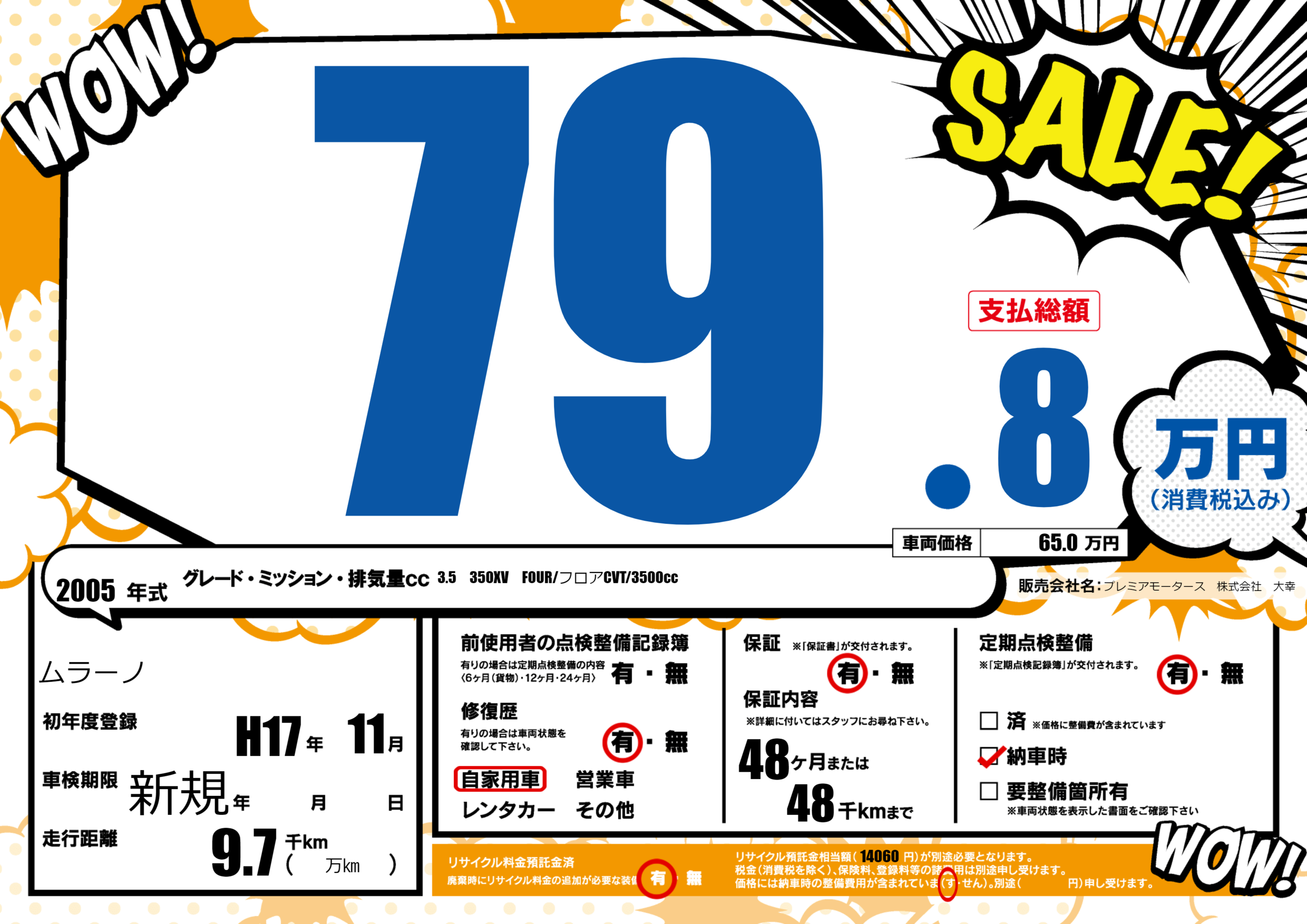 | 走行キロ | 0.9万km | 初年度登録 | H17年11月 |