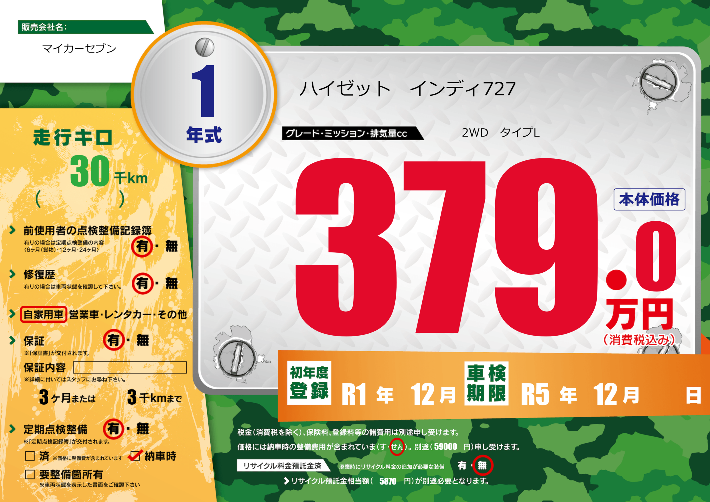 | 車検制限 | R5年 12月 - 日 | ||