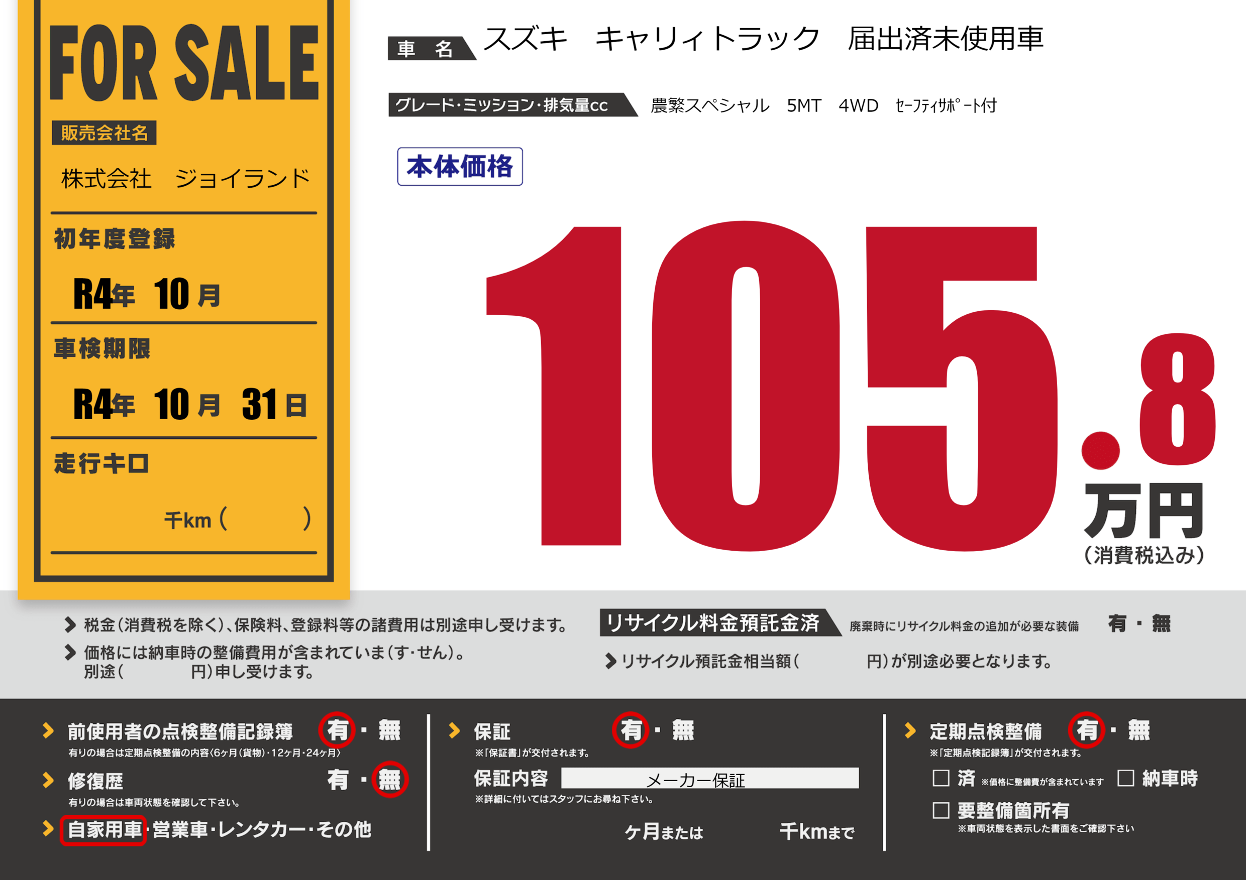 | 車名 | スズキ キャリィトラック 届出済未使用車 | グレード ミッション 排気量 |