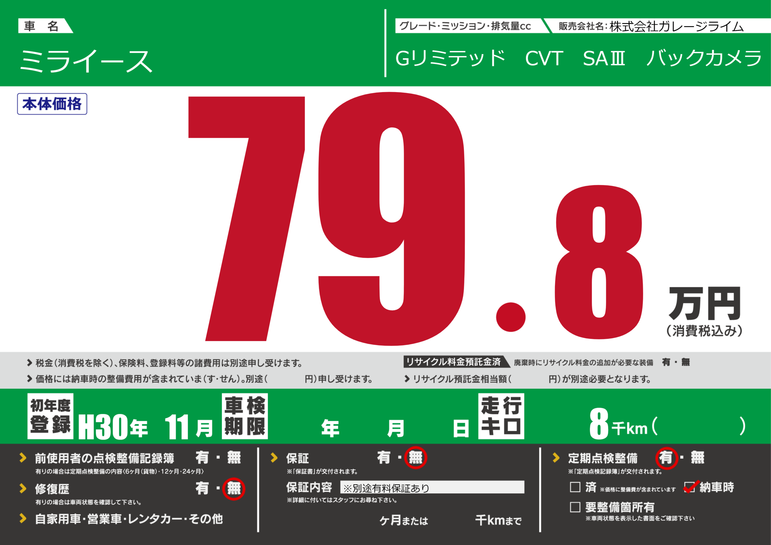 | 定期点検整備 | 定期点検整備あり 納車時あり | ||
