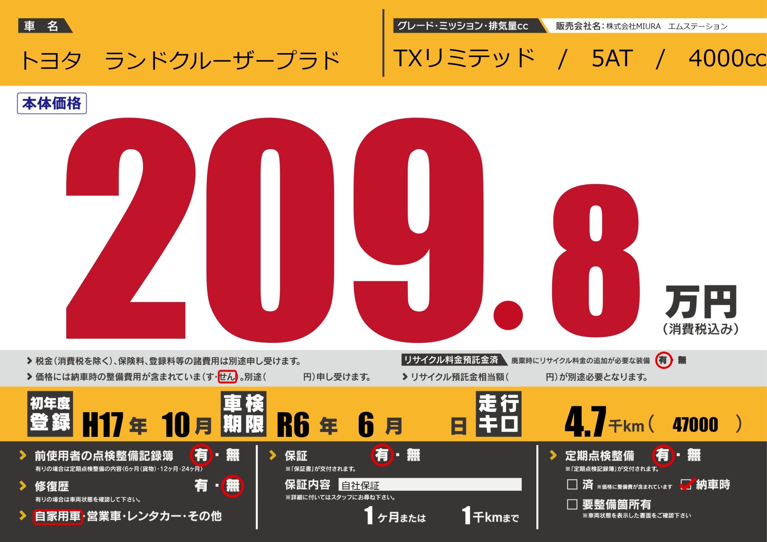 保証付き 保証内容(自社保証) 1ヶ月または(1)千kmまで |