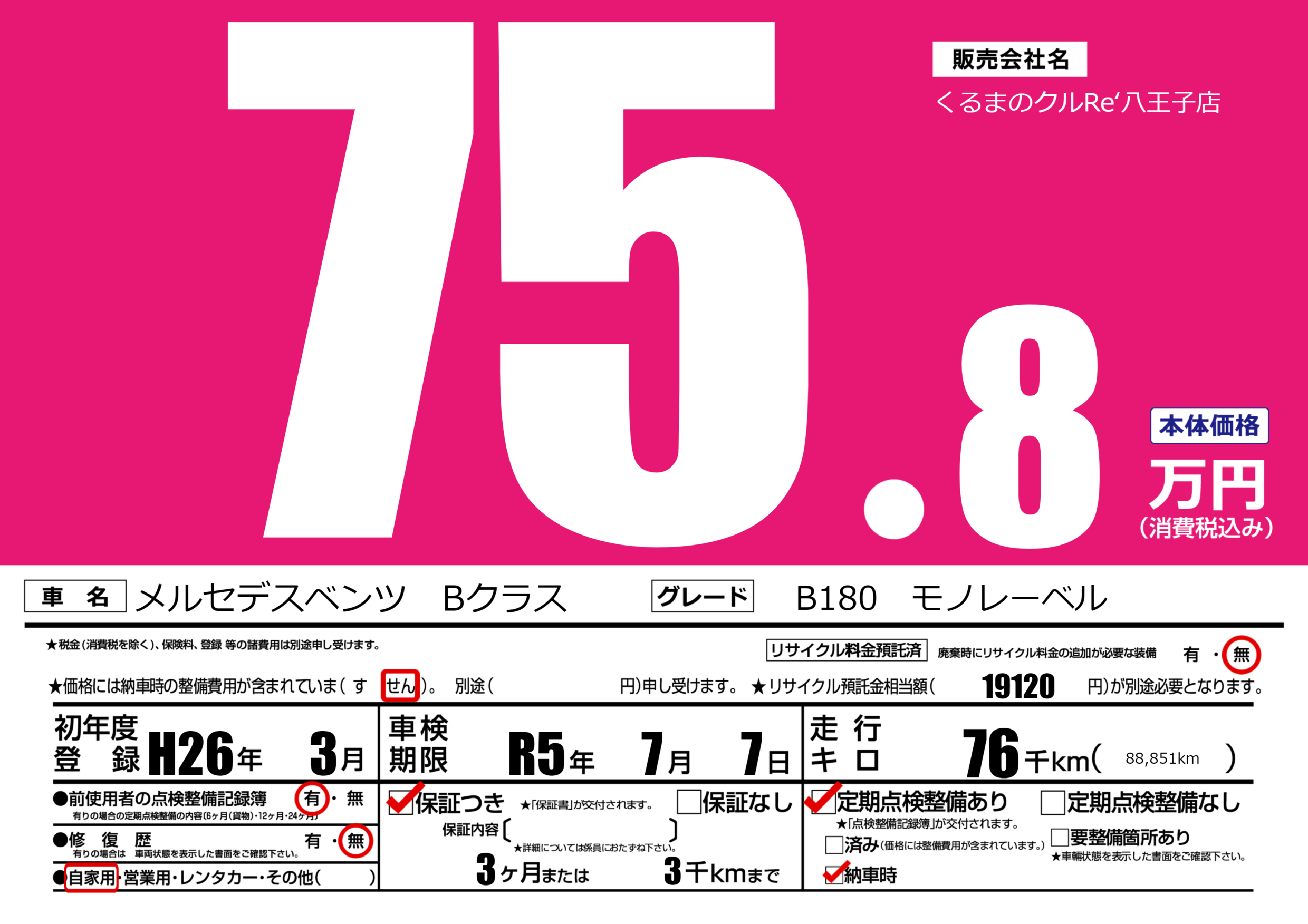 | 車名 | メルセデスベンツ Bクラス | グレード ミッション 排気量 |
