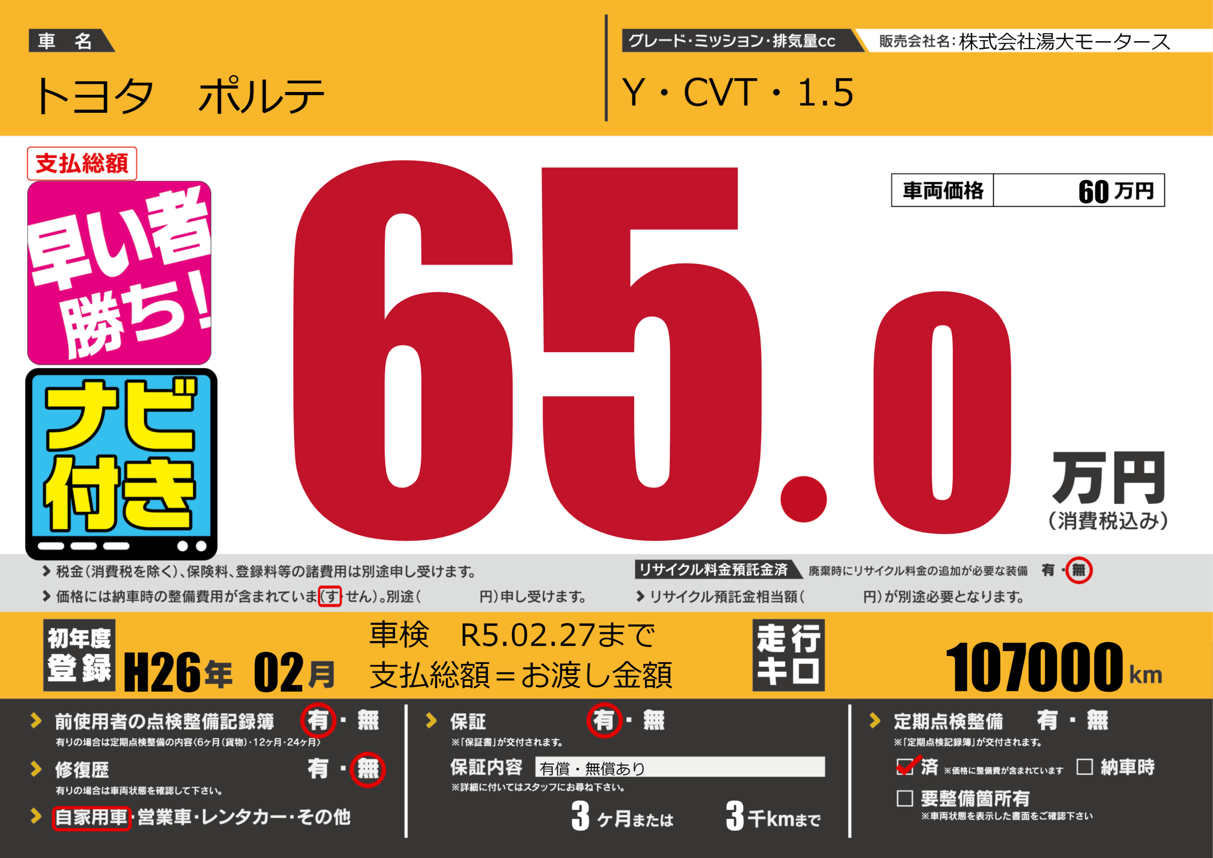 | 定期点検整備 | 定期点検整備済み | ||