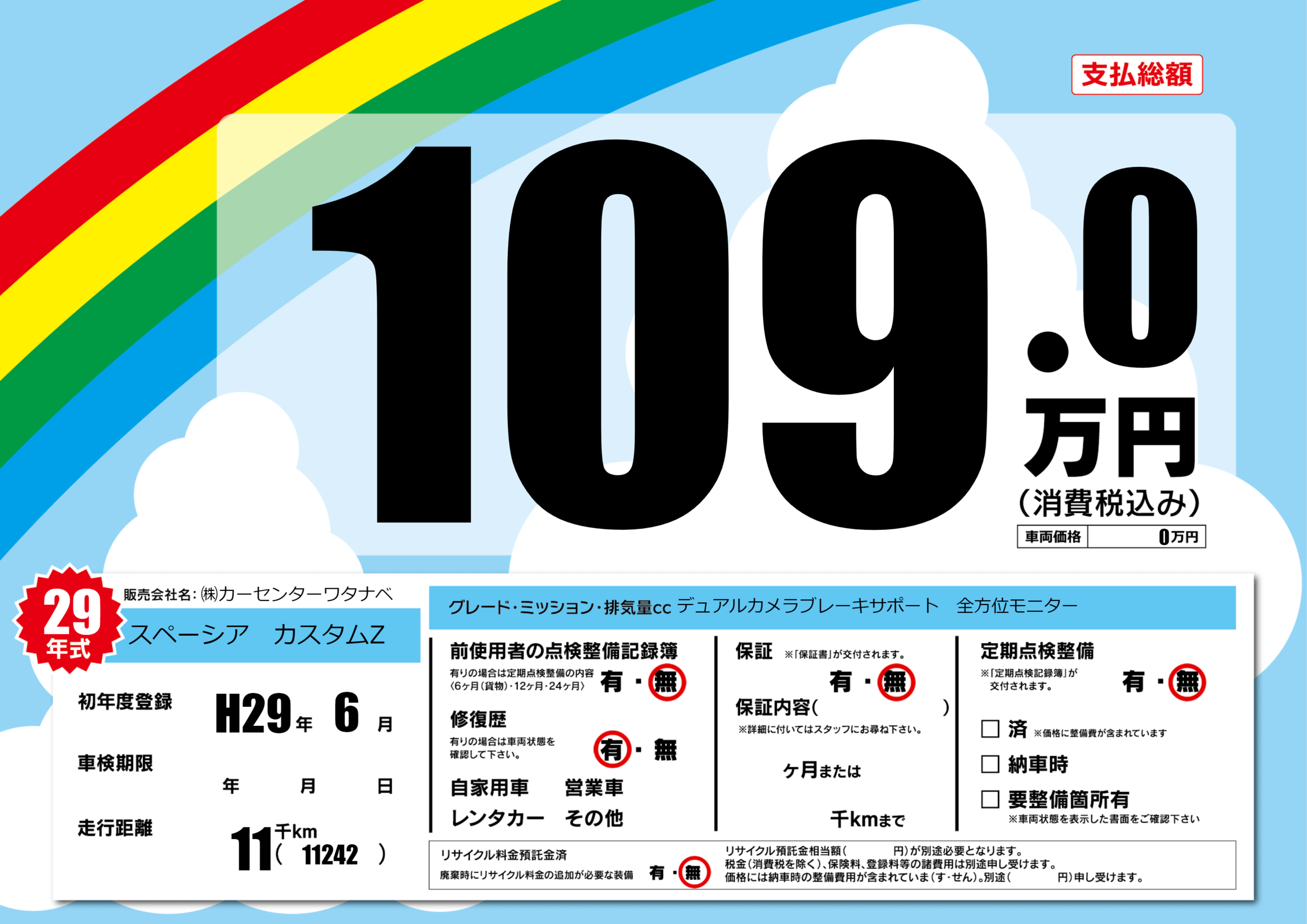 | 走行キロ | 1.1万km | 初年度登録 | H29年6月 |