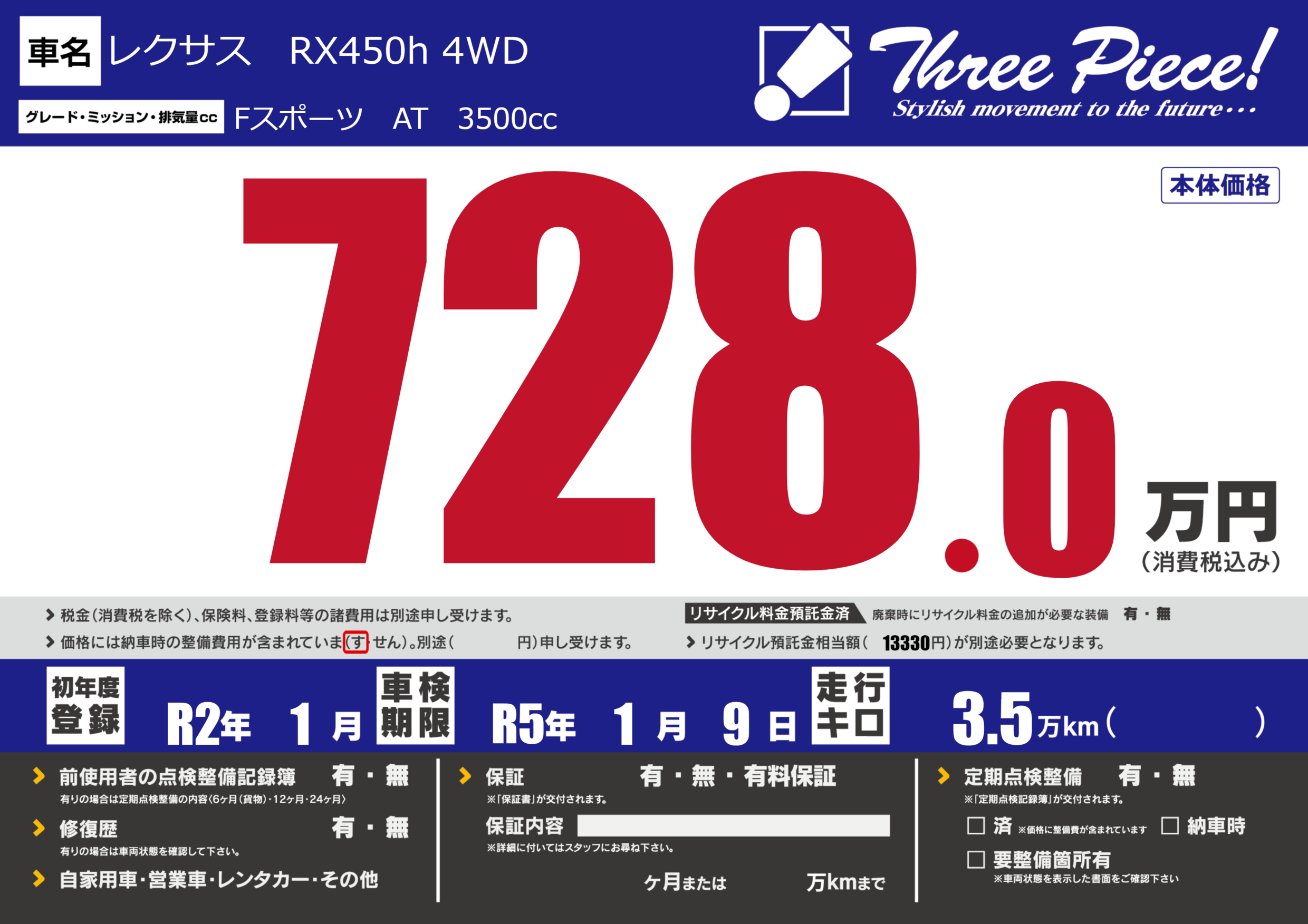 | 車名 | レクサス RX450h 4WD | グレード ミッション 排気量 |