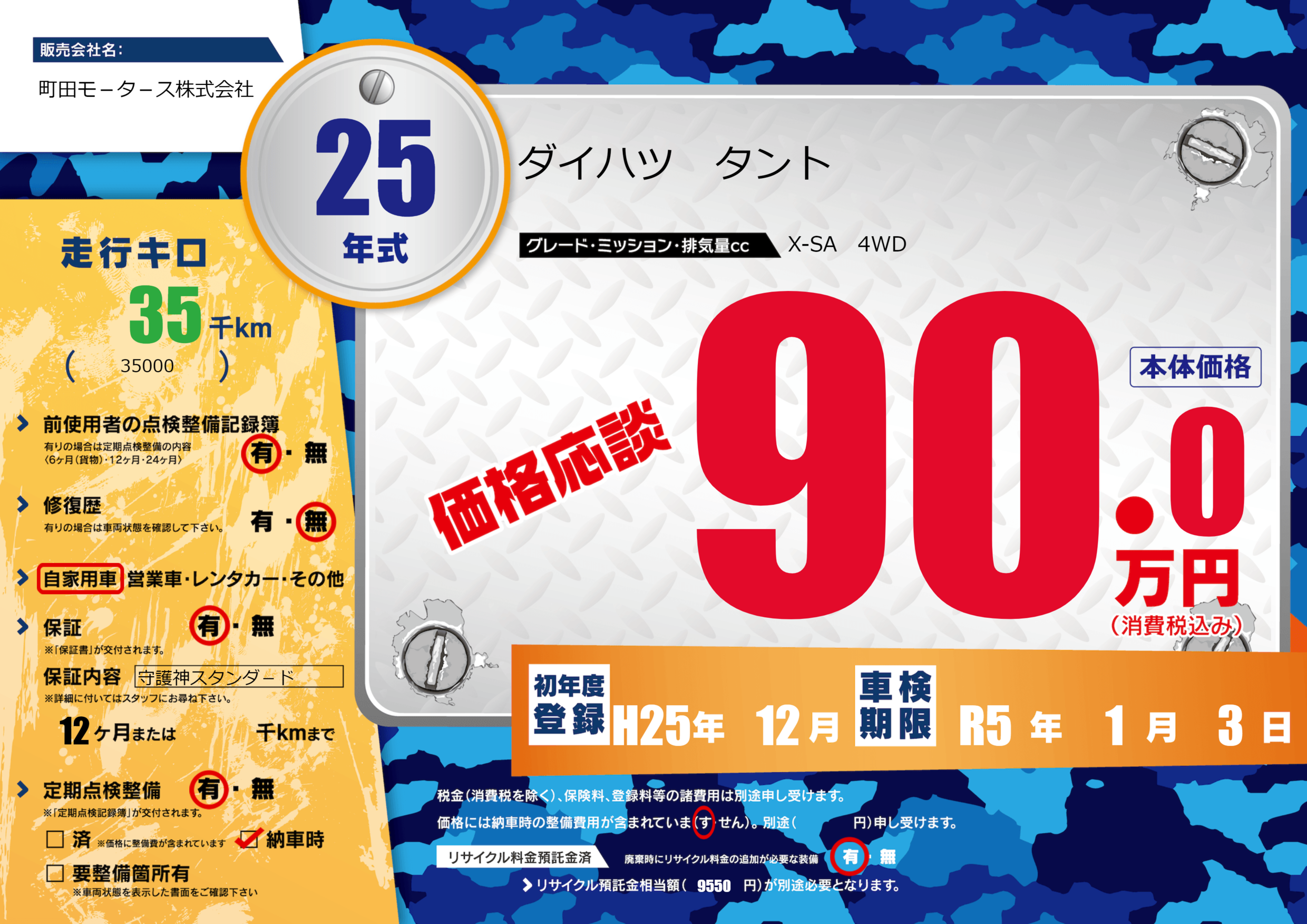 | 車名 | ダイハツ タント | グレード ミッション 排気量 |