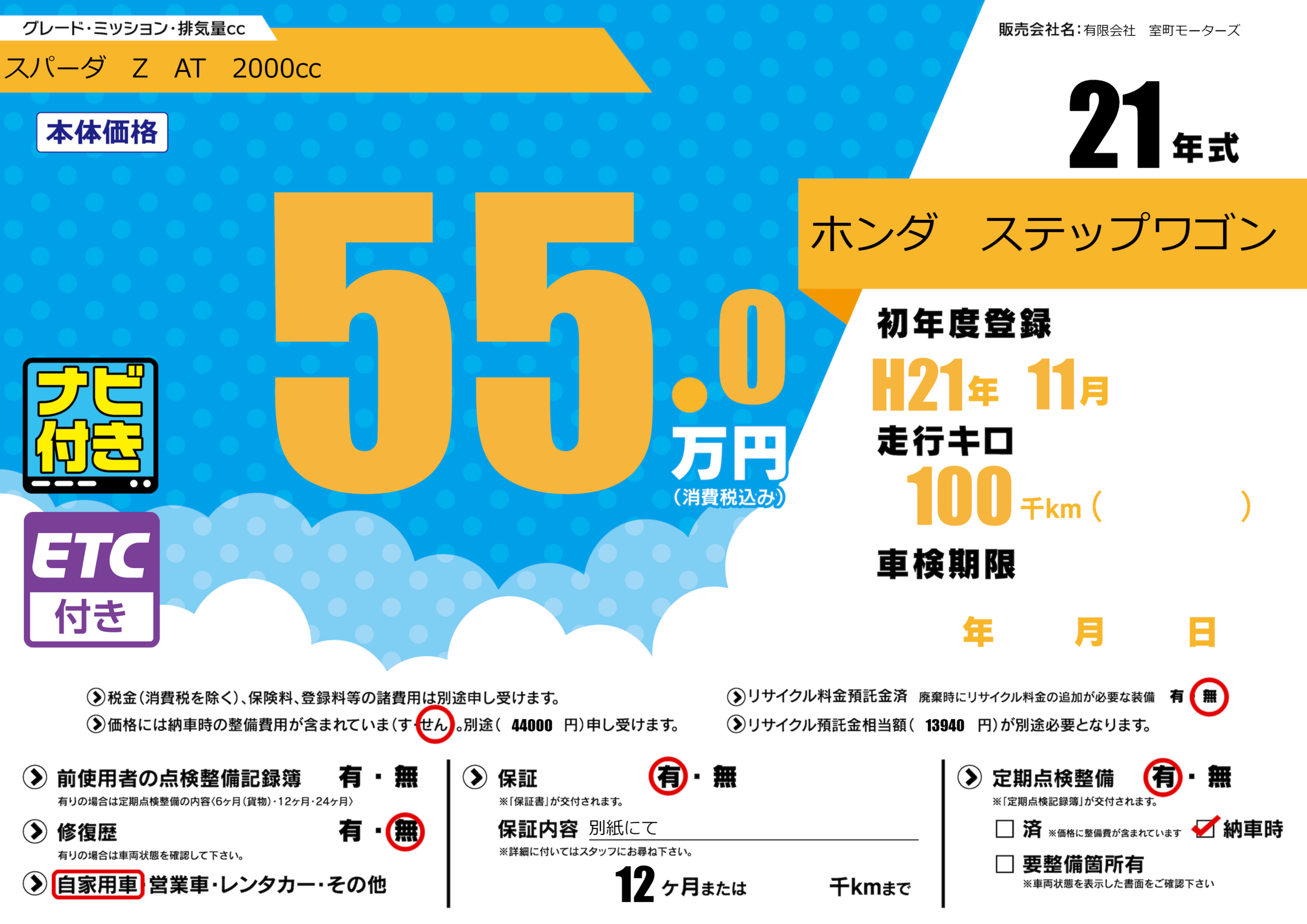 保証付き 保証内容(別紙にて) 12ヶ月または()千kmまで |