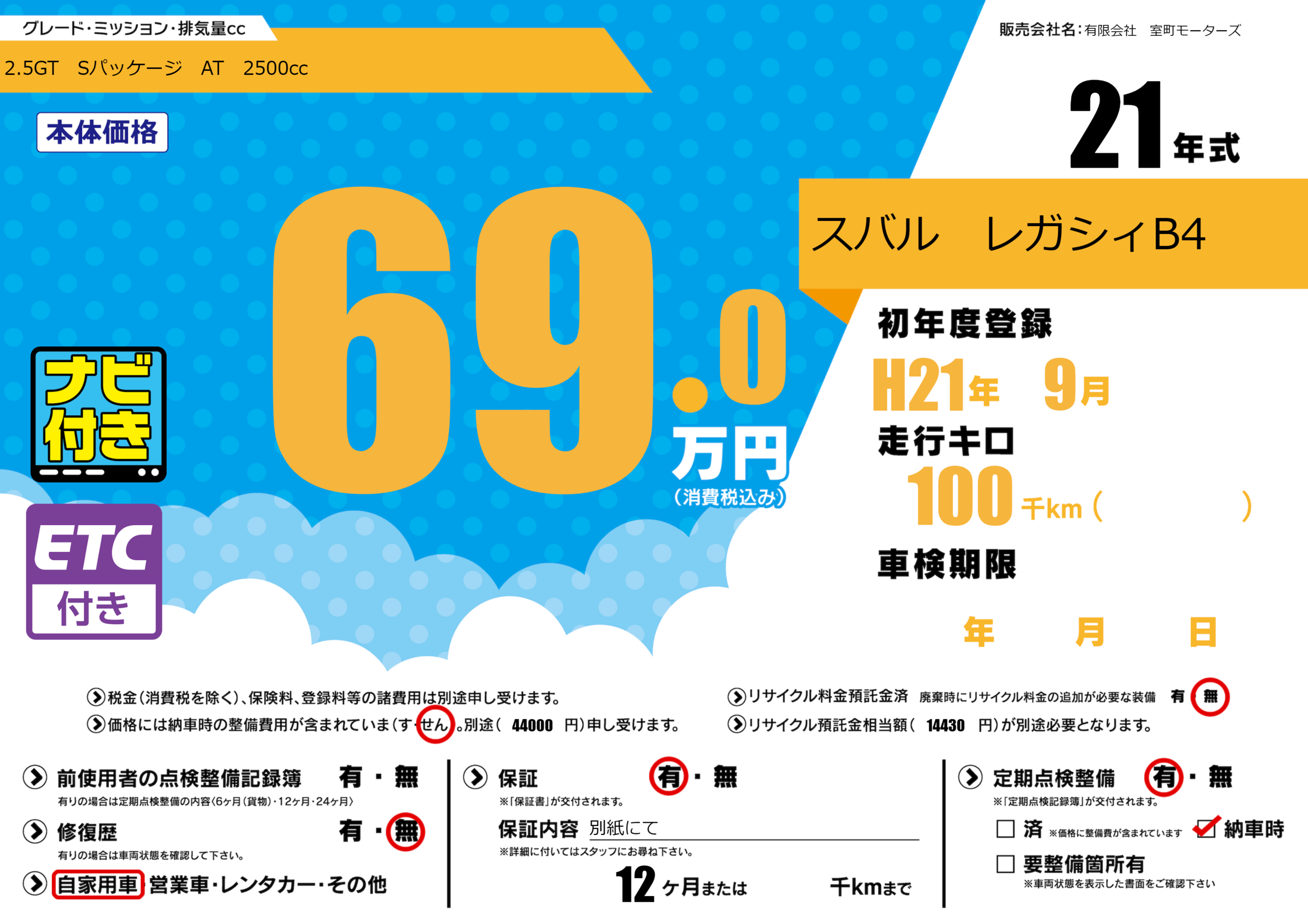 | 車名 | スバル レガシィB4 | グレード ミッション 排気量 |