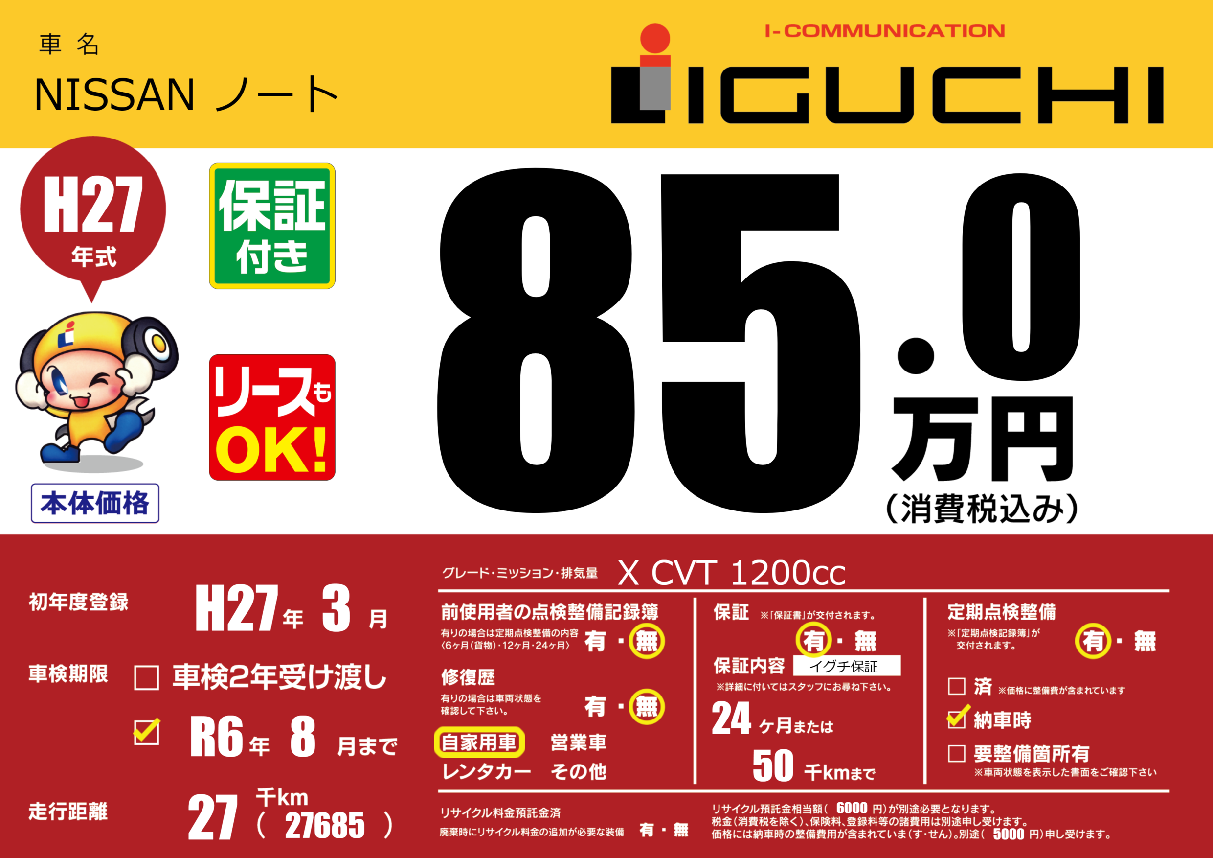 | 車名 | NISSAN ノート | グレード ミッション 排気量 |