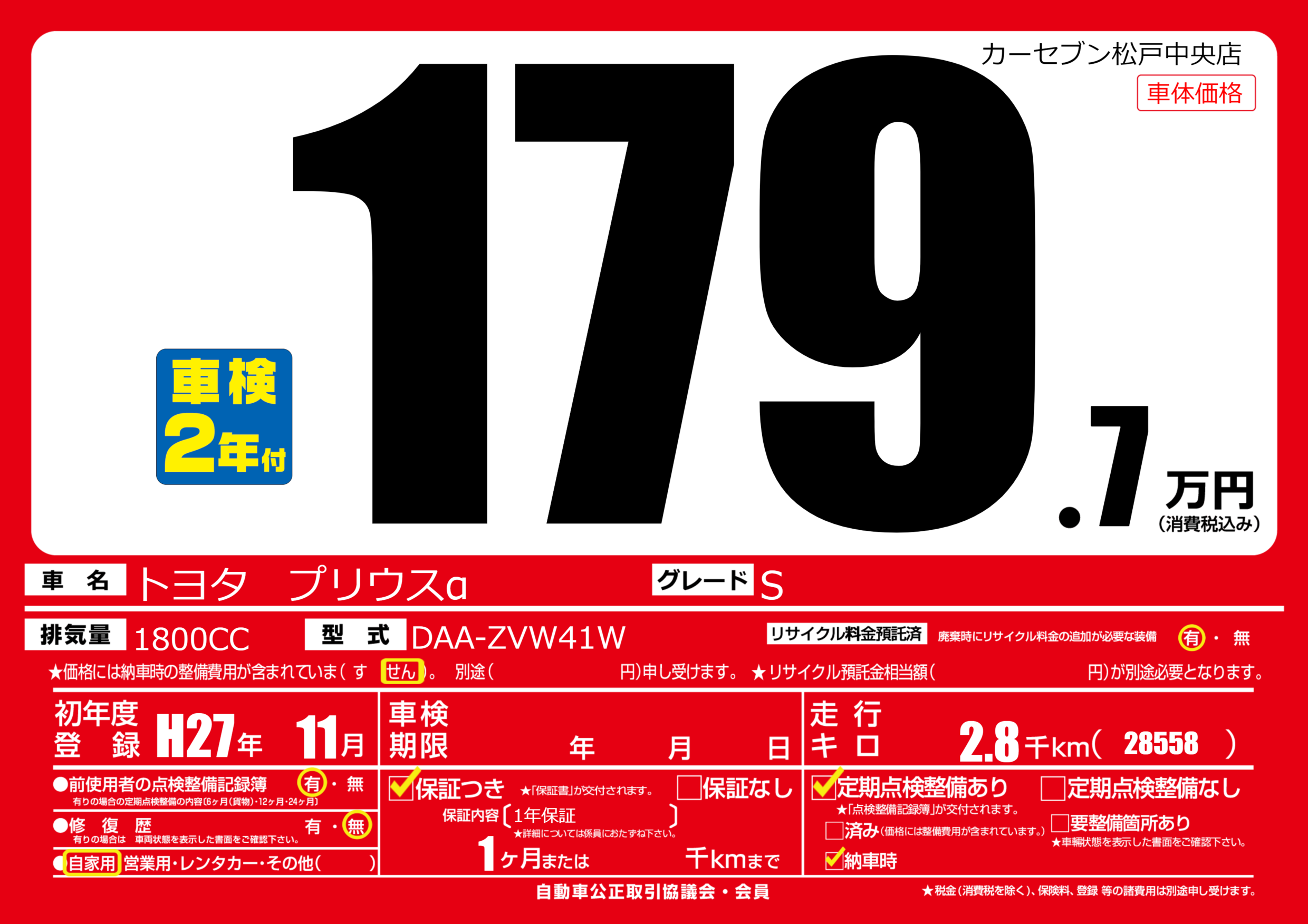| 車名 | トヨタ プリウスα | グレード ミッション 排気量 |