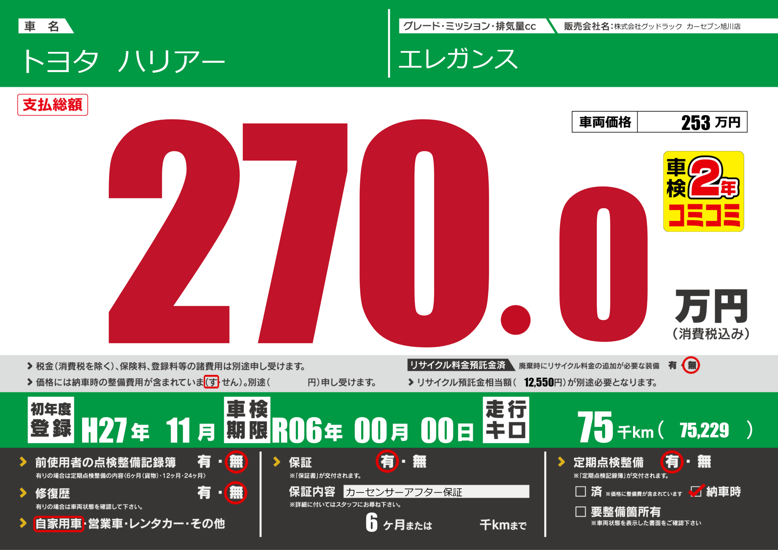 | 走行キロ | 7.5万km | 初年度登録 | H27年11月 |