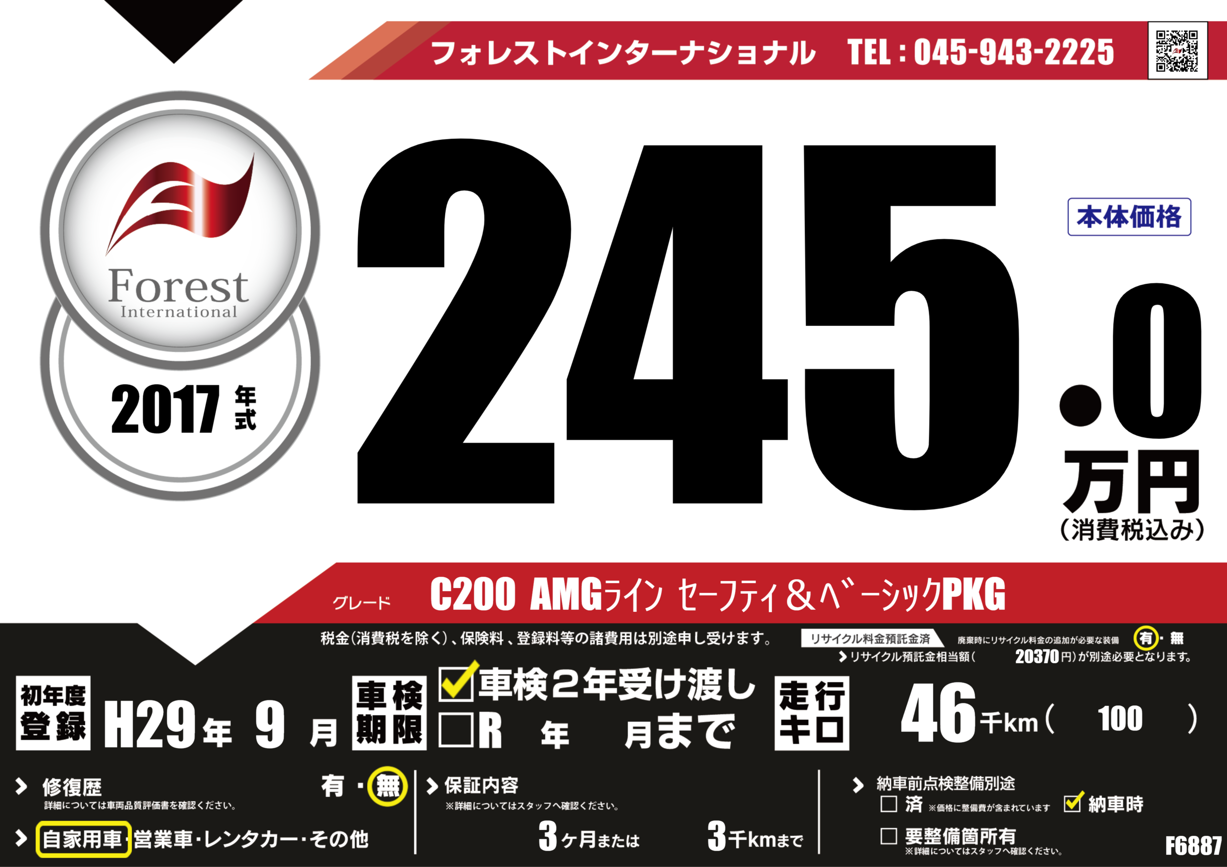 | 走行キロ | 4.6万km | 初年度登録 | H29年9月 |