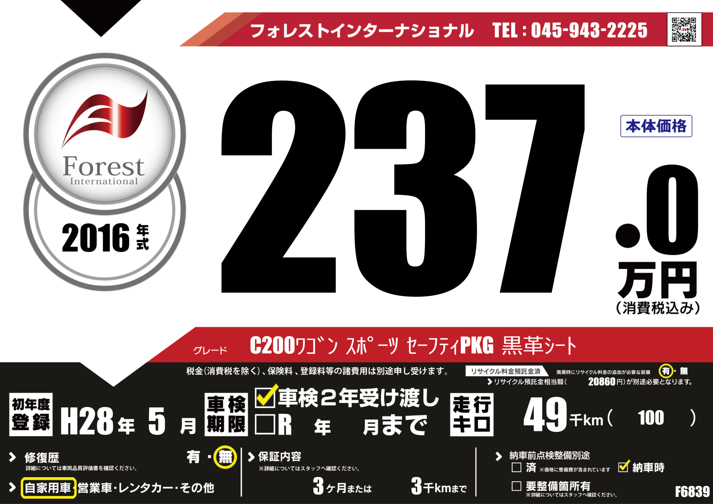 | 走行キロ | 4.9万km | 初年度登録 | H28年5月 |