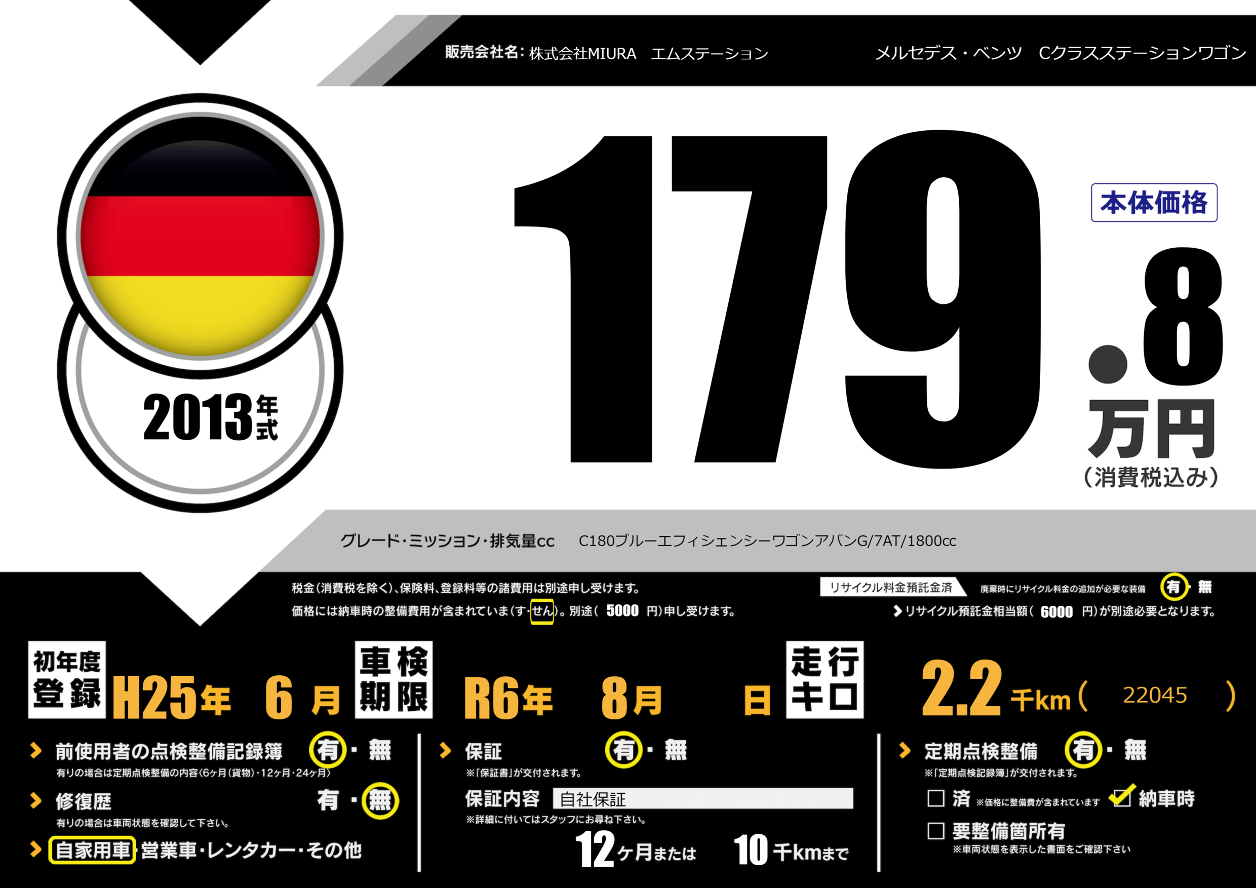 | 車名 | メルセデス・ベンツ Cクラスステーションワゴン | グレード ミッション 排気量 |