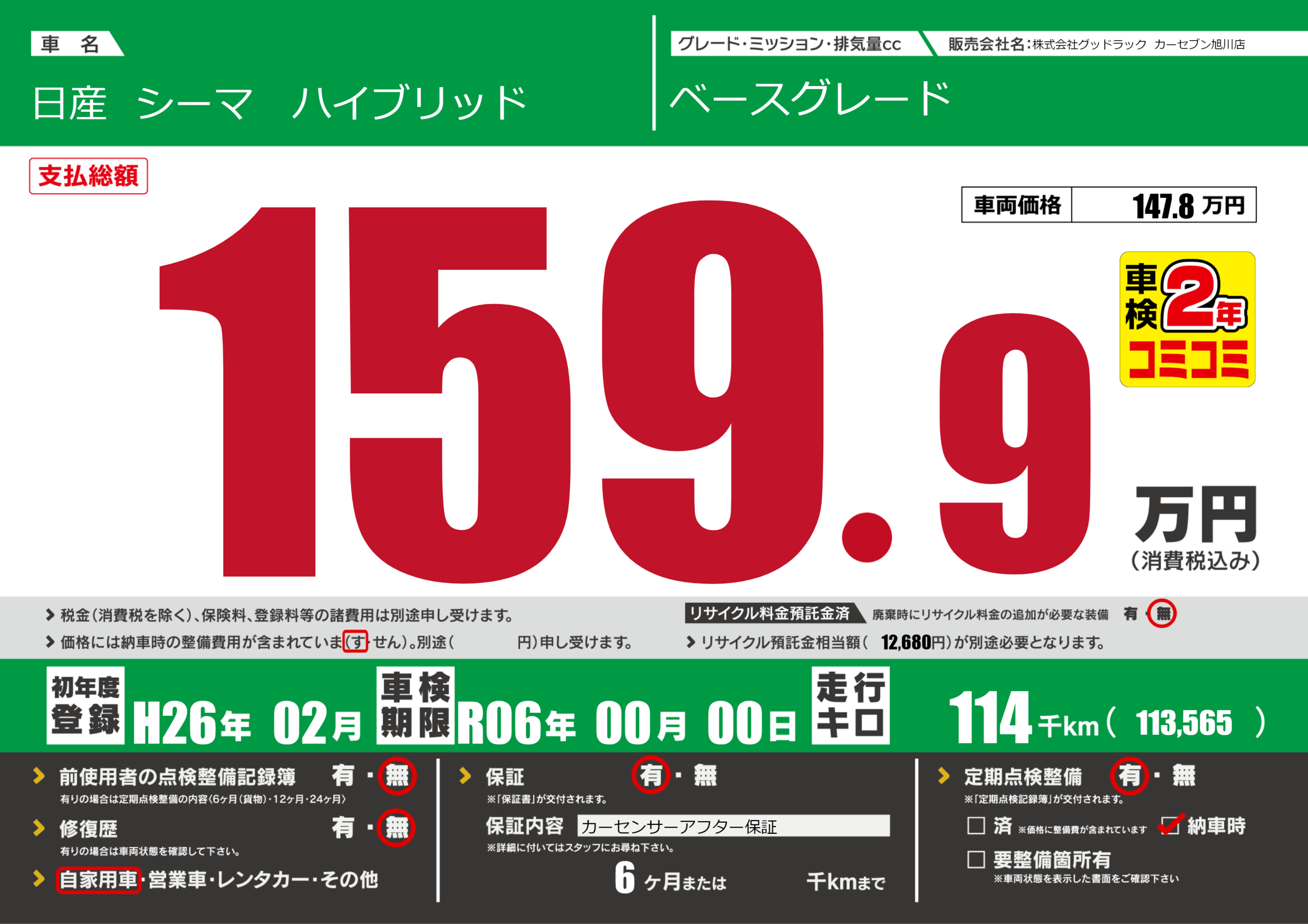 | 車名 | 日産 シーマ ハイブリッド | グレード ミッション 排気量 |