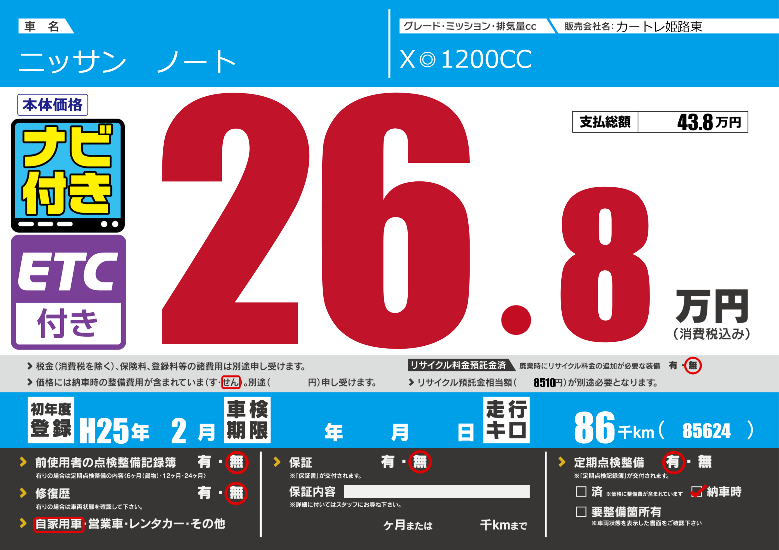 | 車名 | ニッサン ノート | グレード ミッション 排気量 |