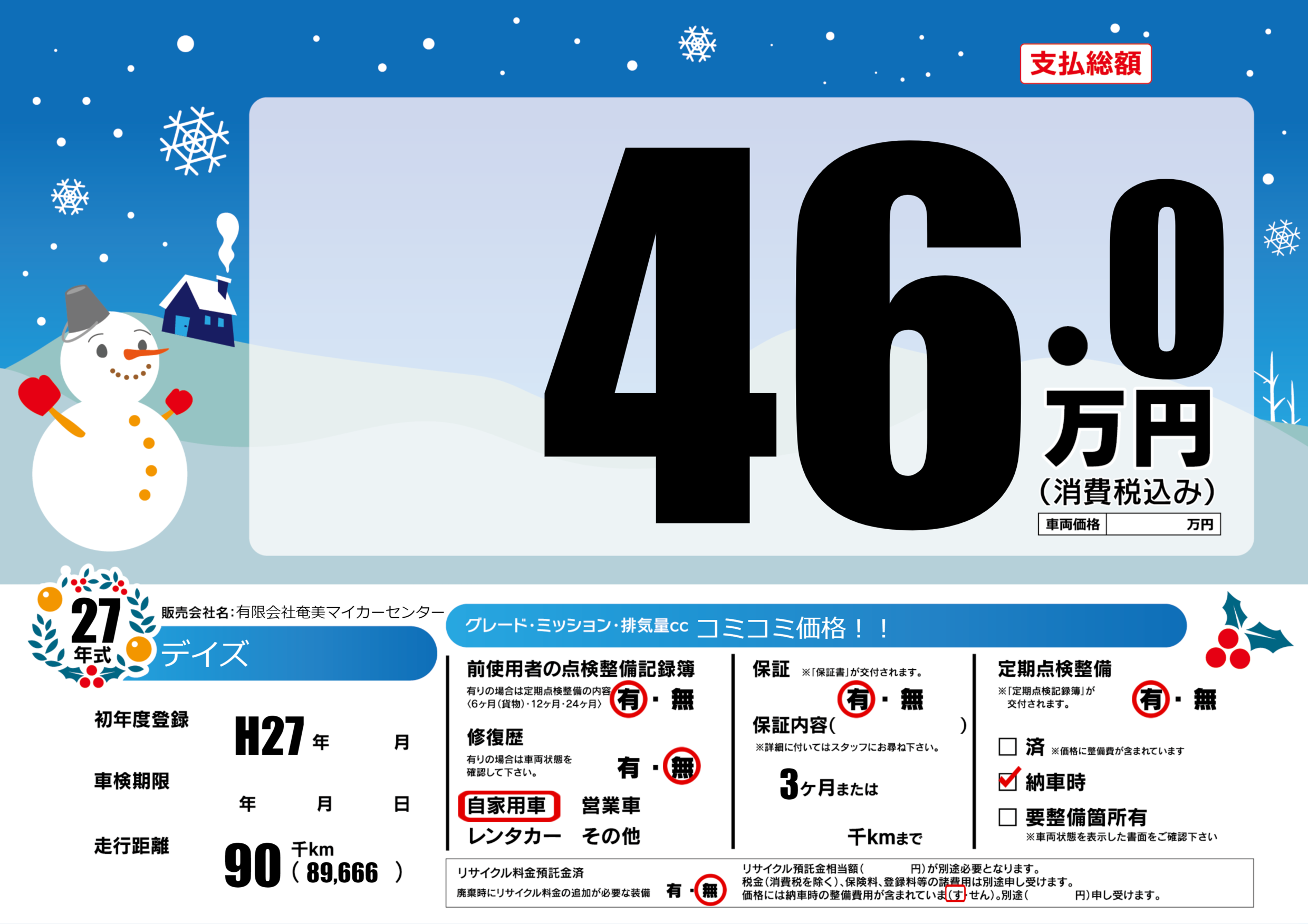 | 走行キロ | 9万km | 初年度登録 | H27年---月 |