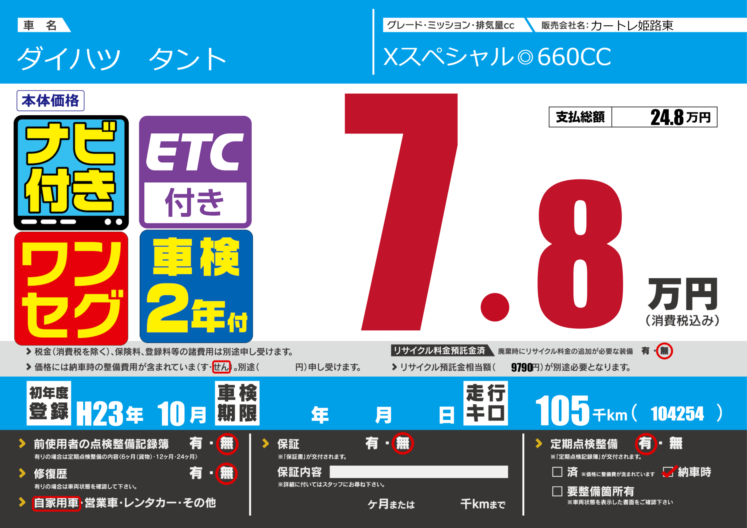 | 走行キロ | 10.5万km | 初年度登録 | H23年10月 |