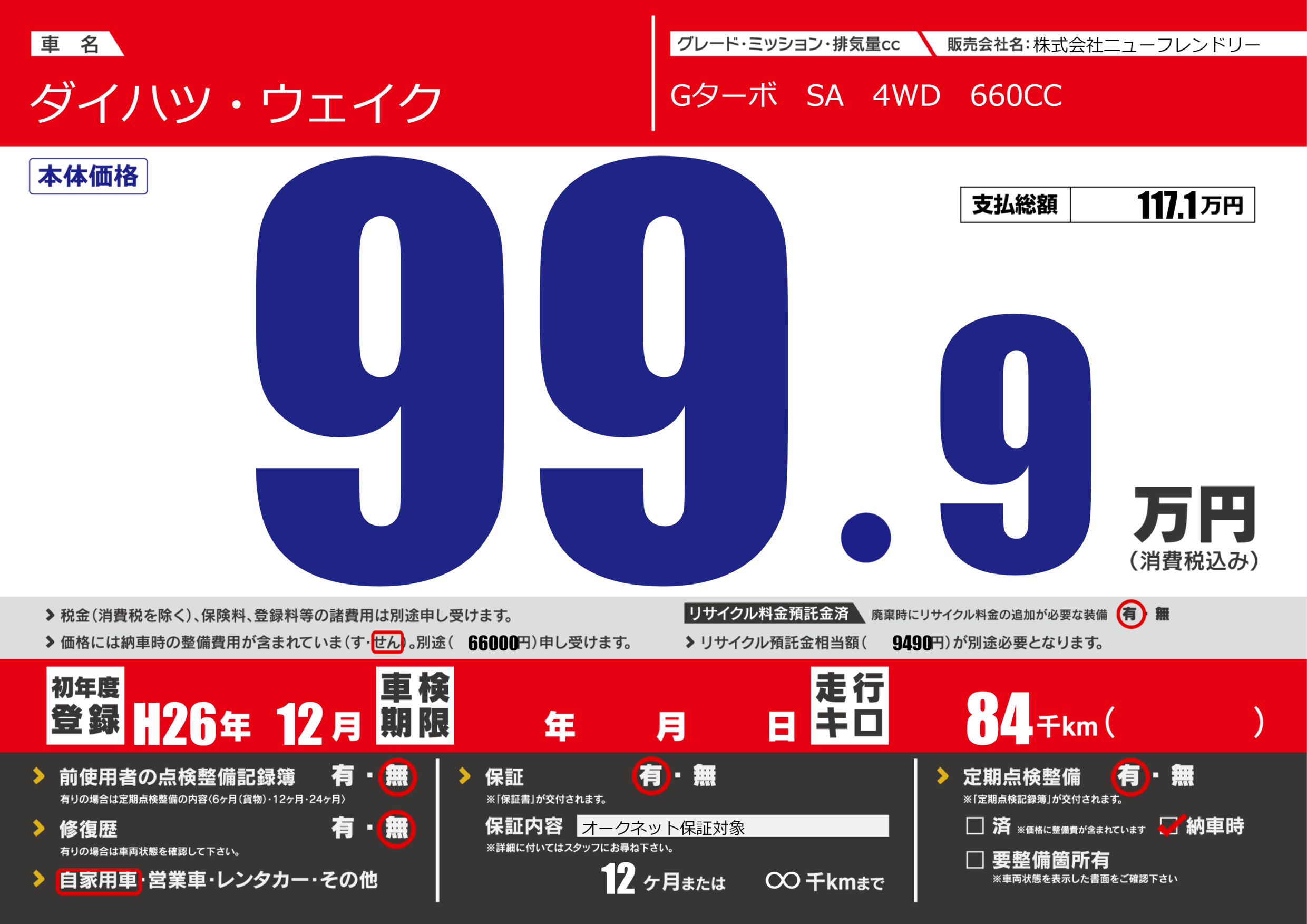 | 定期点検整備 | 定期点検整備あり 納車時あり | ||