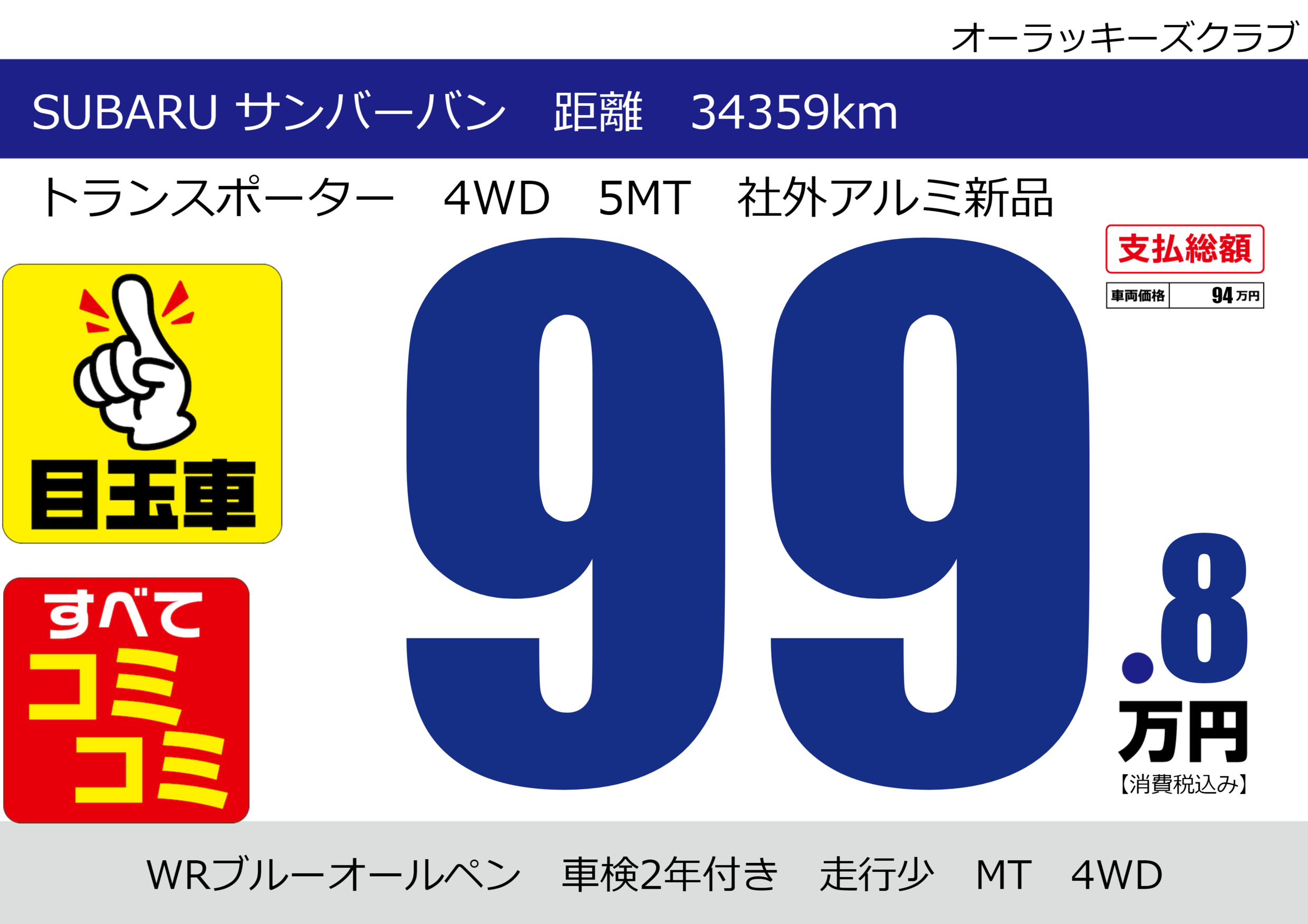 | 車名 | SUBARU サンバーバン 距離 34359km | グレード ミッション 排気量 |